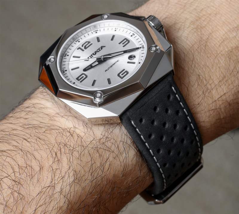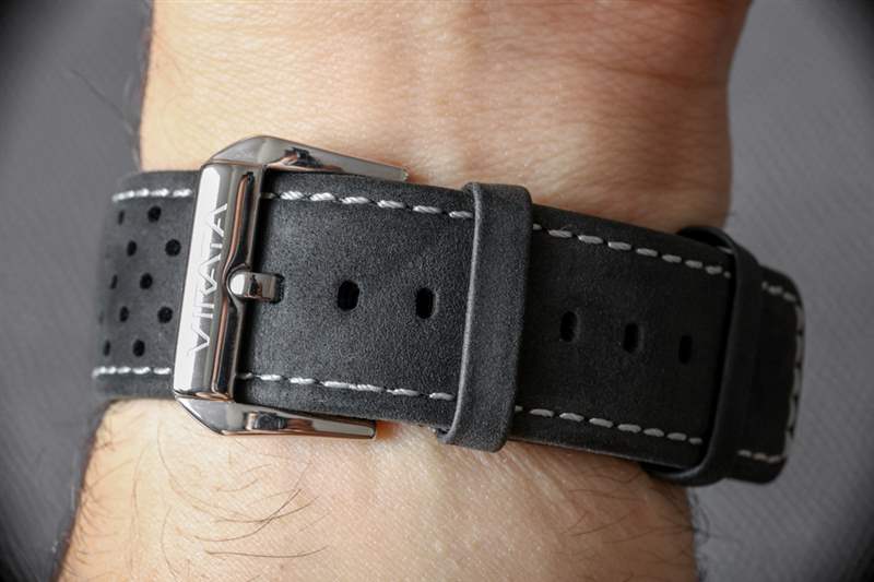 如果沒(méi)有傳統(tǒng)的表耳,44 毫米寬的表殼比您想象的要小,而且看起來(lái)也比其大約 13 毫米的厚度可能暗示的要薄。這種更纖細(xì)的佩戴輪廓可以歸因于表殼的錐形特性,其中中間部分比頂部或背面更寬。鑒于此表殼尺寸,22 毫米寬的表耳可制成合適尺寸的表帶。Virata 提供帶有一些對(duì)比色縫線的黑色穿孔皮革表帶。表帶在幫助表殼感覺(jué)運(yùn)動(dòng)和現(xiàn)代方面做得很好,但我認(rèn)為創(chuàng)意所有者可能會(huì)找到其他表帶,幫助手表更好地適應(yīng)他們的個(gè)性(除非你穿了很多穿孔的衣服或配飾)。