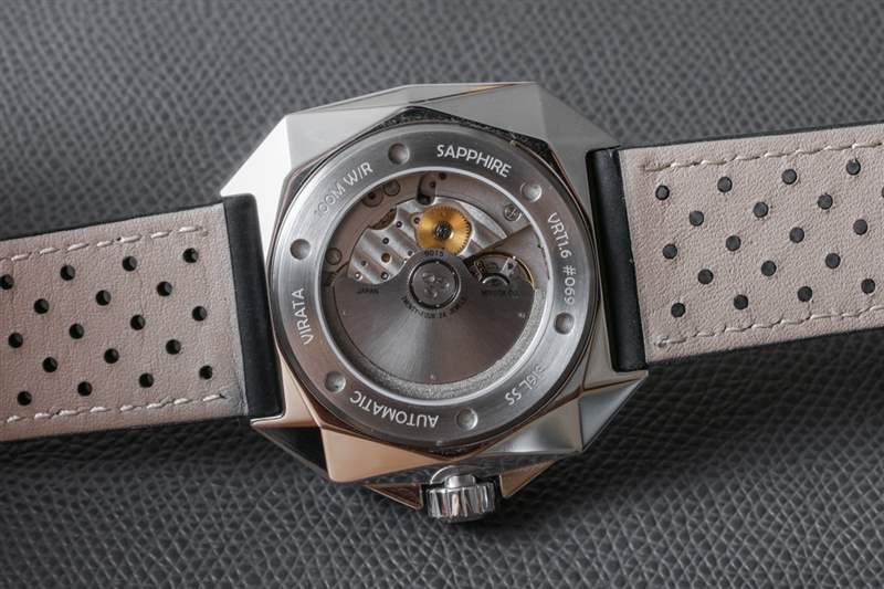 Virata 采用鋼材質(zhì),腕部寬度為 44 毫米(防水深度達(dá) 100 米),提供 VRT 系列手表的幾種表殼飾面,從圖中的高拋光到拉絲鋼以及黑色 PVD ??涂層鋼。該品牌首次推出的腕表系列包括六款不同版本的 VRT,每款腕表限量發(fā)行 33 至 100 枚。