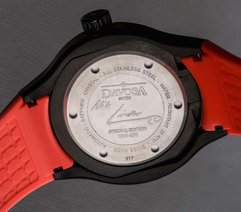 表殼背面是著名的自由潛水員 Nik Linder 的浮雕簽名,Davosa 與他一起開(kāi)發(fā)了 Apnea Diver 手表。他是少數(shù)佩戴這款腕表并能充分利用其功能的人之一。然而,這并不能完全解釋為什么 Davosa 包含可以從表帶上取下內(nèi)殼的功能。這也恰好是手表寬 46 毫米(厚 12.5 毫米)的原因,但實(shí)際上它的磨損程度與您希望的一樣。我也喜歡手表在手腕上的方向如何讓表殼稍微支撐一下,這樣一目了然。