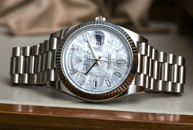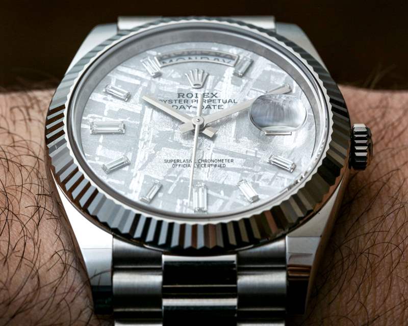 白金是一種非常奢華的材料,但它通??雌饋聿⒉槐蠕摱?。白金的重量增加意味著它的佩戴方式與鋼不同,但除非你碰巧身邊有一位知道 Day-Date 40 只有黃金和鉑金的手表愛好者,否則這款手表很容易被誤認為是不銹鋼。引人注目的隕石表盤上鑲有鉆石,這款特別的勞力士總裁腕表在奢華與精致之間劃清了界限,進一步增添了它的個性和個性。