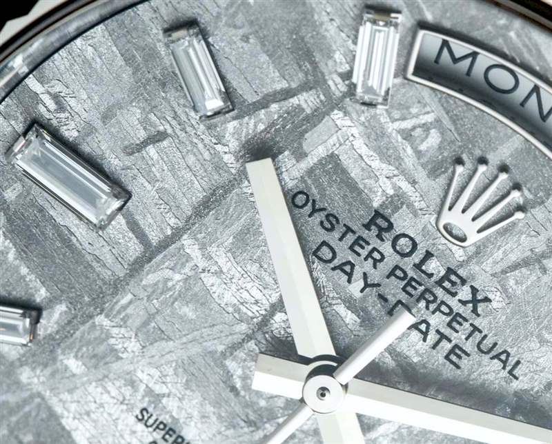 勞力士將這款隕石表盤與長方形切割鉆石時標配對,使其成為一款奢華而優雅的時計。添加裝飾元素,如鉆石,很難保持手表的陽剛氣質,但鉆石時標的微妙之處使其發揮作用。當然,表盤在 12 點鐘位置設有星期窗口,在 3 點鐘位置設有日期窗口。事實上,當勞力士 Day-Date 腕表最初于 1956 年問世時,它是第一款配備同時顯示日期和星期幾的表盤的腕表。廣告訊息廣告信息結束
