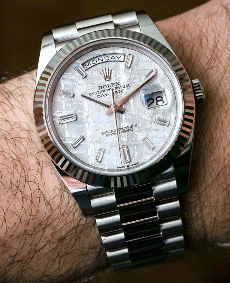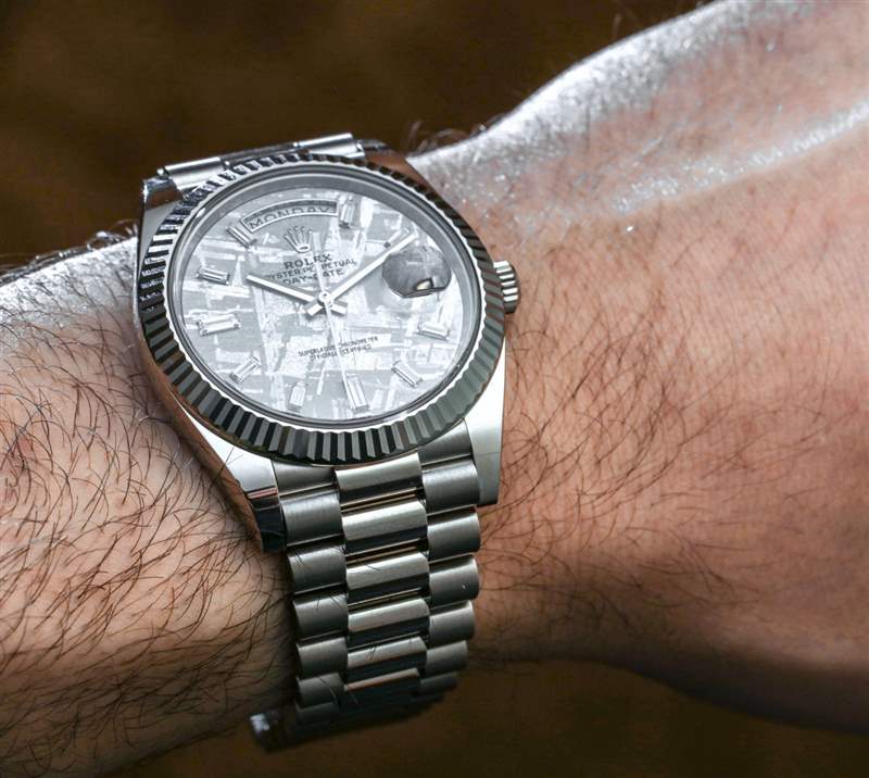 我發現隕石表盤是勞力士 Day-Date 40 主題的美麗而引人注目的補充。勞力士只使用最優質的材料,尤其是其高端系列,因此您會得到一塊既清晰又實用的絕妙天然材料。這款腕表的一大魅力在于將稀有材料積聚在一個產品中,因為它結合了 18ct 白金、鉆石和隕石,所有這些都被認為是珍貴的材料。雖然這些材料的實際市場稀缺性存在爭議,但將這些材料整合在一起的目的之一是提高手表的內在價值。