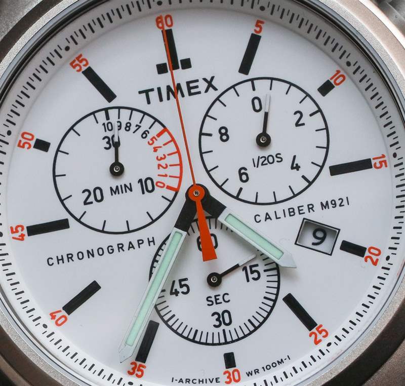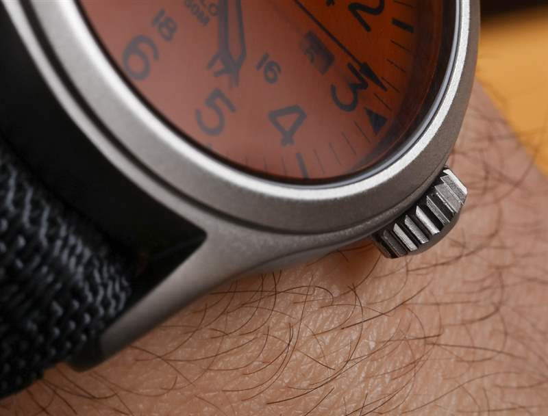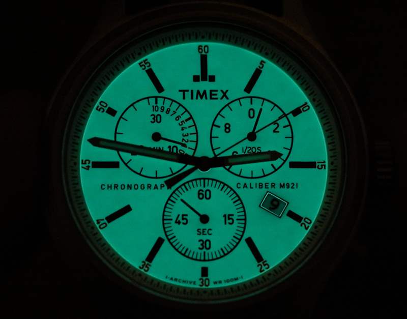 Allied Chrono 表殼防水深度達 100 米,手腕上的寬度為 43 毫米。Timex 指出,表殼材料是黃銅(就像許多機械手表機芯部件一樣),而外部是鋼。他們并不完全清楚這是如何實現(xiàn)的,盡管我猜外面的鋼是電鍍的,然后進行了噴砂處理。Allied Chrono 表盤簡單(以復古風格的方式)但清晰且有吸引力。表盤的“淺水泥”色與略帶光澤的時標和橙色裝飾相得益彰。指針尺寸合適,易于閱讀,同時還涂有發(fā)光體。我想在這里向 Timex 提出一個建議,即指針的顏色與時標的顏色相同,以進一步實現(xiàn)美學和諧。迷失在黑暗中觀看你說?不在這里。我們大多數(shù)手表收藏家早已忘記了 Timex 的標志性功能,即他們稱之為 INDIGLO 的背光。該功能仍然像我小時候第一次玩它時一樣整潔 – 通過按下表冠來激活。按下表冠時,整個表盤會發(fā)出“外質(zhì)”綠光,即使在完全黑暗的環(huán)境中也能輕松讀取。所以也許讓雙手變黑并不是一個糟糕的主意……或者至少是黑色的輪廓。