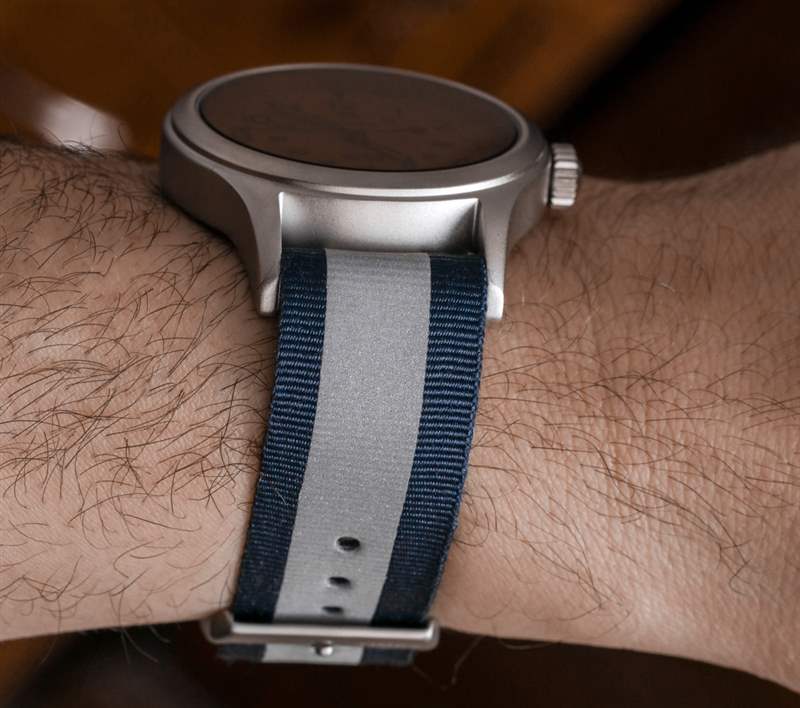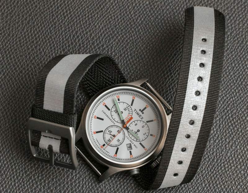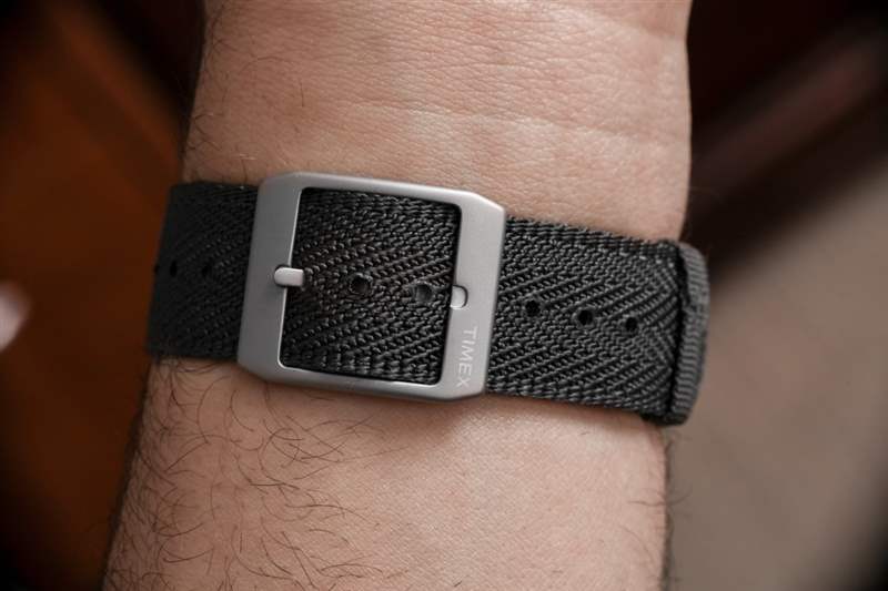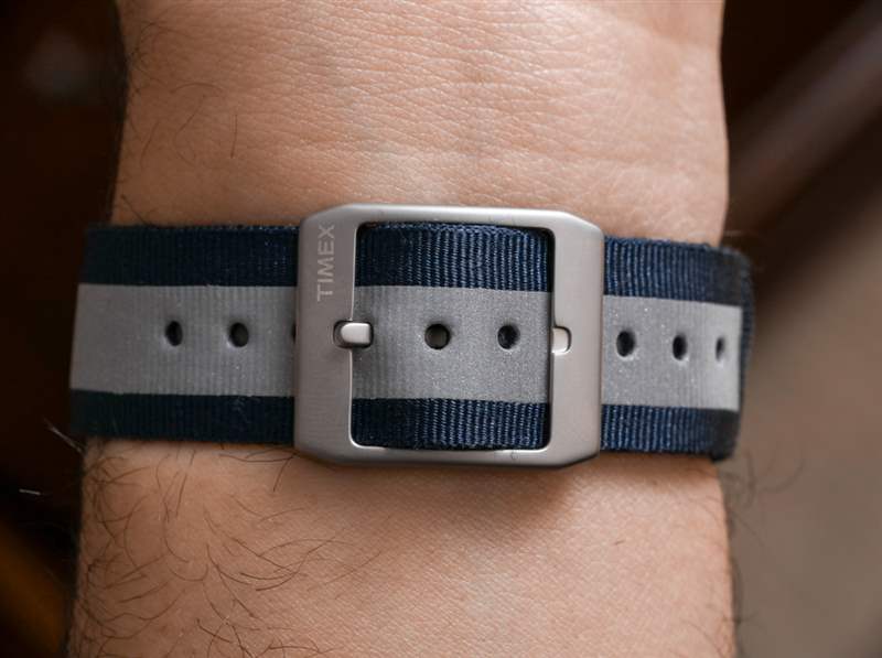 我記得 Timex 去年向我展示了這些表帶并為它們感到興奮。這條灰色表帶的一側(cè)是編織滌綸,帶有迷人的圖案。另一面——這就是我在圖片中的穿著方式——是尼龍的,中間有一條反光的“賽車條紋”。表帶由兩個不同的層制成,這本身就很有趣。反轉(zhuǎn)表帶實際上非常簡單,只需拉出表帶,翻轉(zhuǎn)它,然后將另一側(cè)編織成彈簧條。表帶最巧妙的設計特點之一是如何讓帶扣舌移動到任一側(cè),具體取決于您使用的表帶的哪一側(cè)。我也喜歡它的可逆性非常謹慎——這意味著如果沒有人告訴你表帶設計為可逆的,你可能很容易錯過這個細節(jié)。