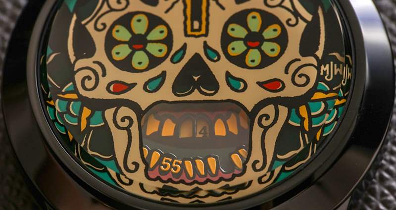 Last Laugh 和 Last Laugh Tattoo 腕表采用改良的中國制造機械機芯 TY1723 自動機芯。否則,這種罕見的運動不可能有這么低的價格。機芯在三個圓盤上顯示時間(兩個用于小時顯示,一個用于分鐘顯示),這些圓盤設計在表盤上骷髏的齒中。易讀性主要受到較小尺寸的牙齒的影響,但總體而言,該概念確實提供了足夠的易讀性,可以在良好的照明條件下讀取時間。