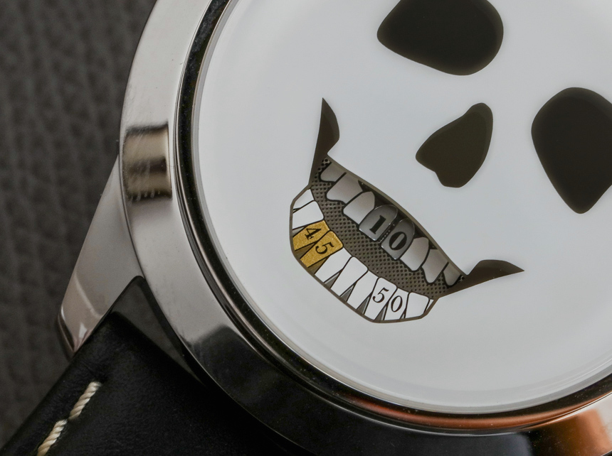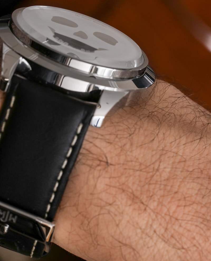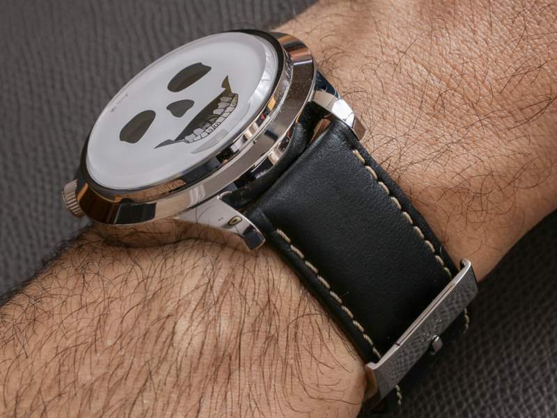 Last Laugh XL 是一款外觀更基本的表盤,只有白色背景下的骷髏特征。小細節很有趣,例如頭骨眼睛的鏡像。這是兩個型號中我最喜歡的,盡管我不能完全確定我為什么喜歡穿它。我同情“memento mori”(“基于骷髏”物品的哲學理由)的概念,盡管我傳統上不是“骷髏手表”佩戴者。我承認 The Last Laugh XL 在個性方面得分很高,而且也不覺得像一塊便宜的手表。
