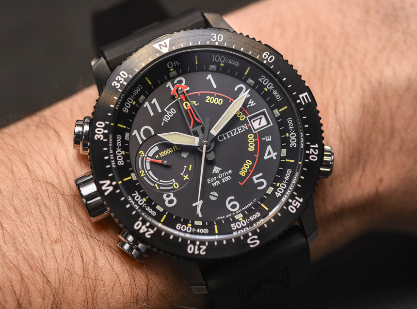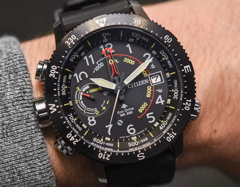 話雖如此,表盤的絕對深度并沒有讓 Altichron 感覺像其他任何東西。表盤需要這么深,因為中心柄需要容納五只手,再加上表盤上的第六只手,用于多功能輔助表盤。您還可以得到日期。據我了解,這款更新的 Promaster Altichron 的機芯沒有變化,它繼續包含 Citizen caliber 3290 Eco-Drive 石英機芯。除了時間、指南針、高度計(可以測量高達 32,000 英尺的非常大的部分)和日歷外,表盤還有一個用于電池壽命的動力儲存指示器。
