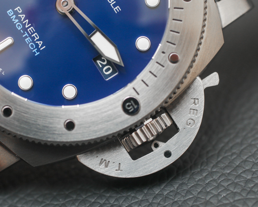 大塊金屬玻璃外殼寬 47 毫米——是的,它穿起來很大(但很舒服)。據我們所知,外殼尺寸與任何其他 Luminor Submersible 1950 型號相同。在 300 米防水表殼內是一個內部制造的沛納海 P.9000 自動機芯,具有三天的動力儲存。在風格上,表盤以藍色為標志,包括深藍色表盤,淺藍色調與鋼色元素混合。
