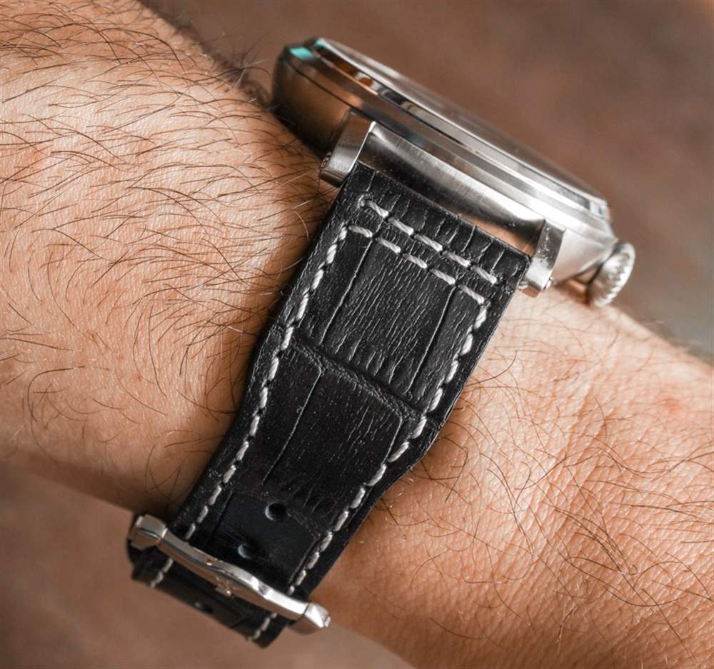 附在表殼上的是一條迷人的鱷魚式黑色皮革飛行員式表帶,帶有對比色縫線。與其他一些飛行員手表(例如 IWC 生產的飛行員計時碼表)一樣,表帶在表殼下方約一英寸處逐漸變細,這既吸引人又增加了佩戴在手腕上的舒適度。雖然 1924 系列 Calibre 39 的實際設計很少是 Dreyfuss & Co. 原創的,但這是一款具有價格競爭力、有吸引力的產品,提供了很多人正在尋找的風格。