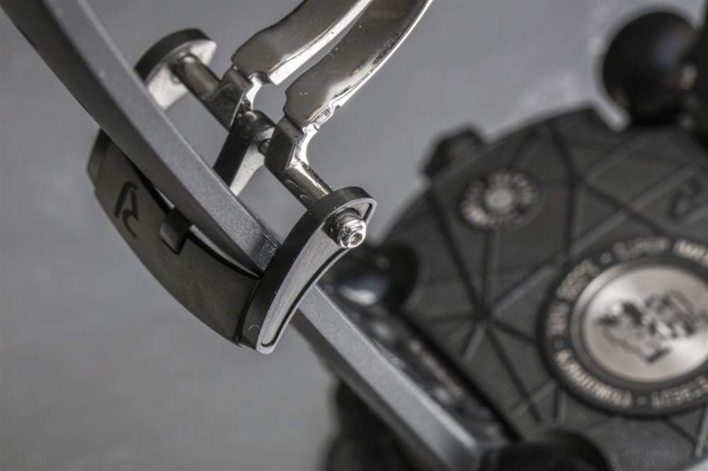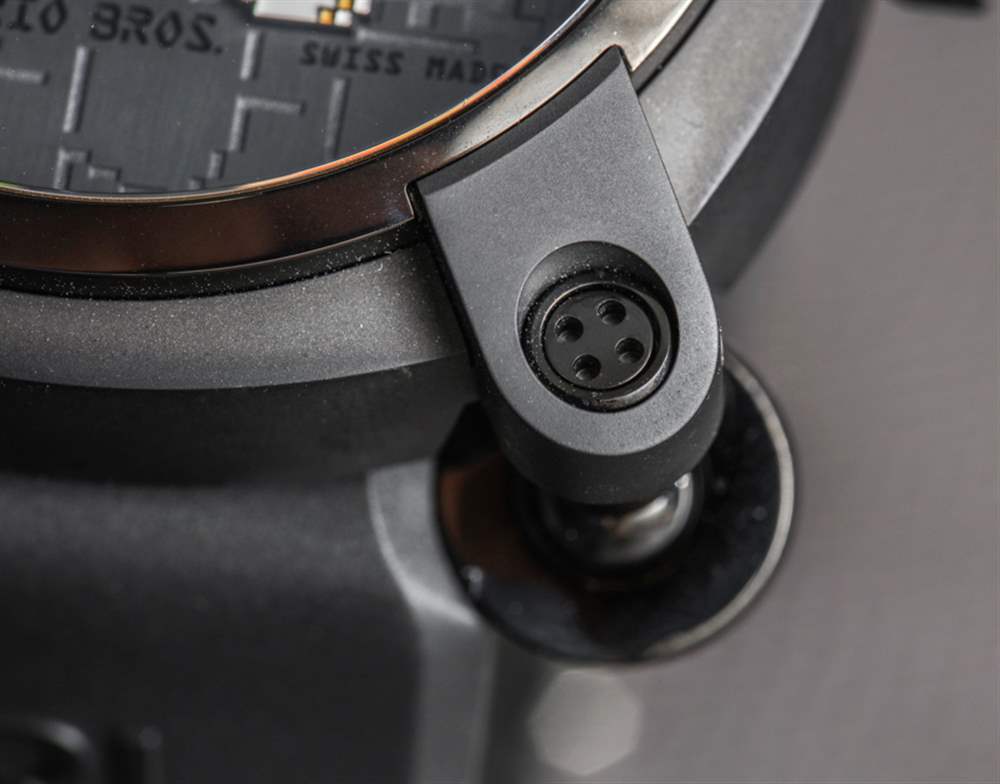 每款以視頻游戲為主題的手表都使用了 Romain Jerome 最初為其 Moon Dust DNA 系列手表開發的 Moon Invader 表殼。這個案例旨在提醒阿波羅時代的帶有腿的登月飛船。這些腿構成了表帶連接到的表殼的凸耳?!奥涞啬_”腿還提供了一些關節,基于這樣的可移動表耳將使原本更大的 46 毫米寬手表更耐磨的想法。我想如果沒有這個功能,這個箱子可能會比現在更不舒服……