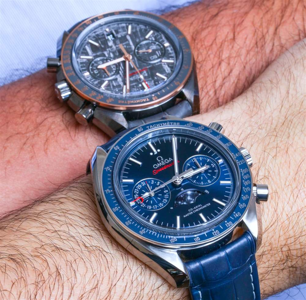 奇怪的是,目前可用的另一款歐米茄超霸月相計時表的表殼尺寸相同(44.25 毫米寬),價格也差不多(實際上要貴一些)。這是歐米茄超霸月球表專業月相計時碼表。這建立在“經典”Moonwatch Professional 風格手表的基礎上,該手表基于更傳統的手動上鏈機芯(在我看來,與 9900 系列相比,它對于日常佩戴來說相當原始——除非你真的喜歡“老派魅力”)。后一款手表使用 1886 型機芯,它在 1861 型的基礎上增加了一個位于 12 點鐘位置下方的上部子表盤,該子表盤具有一個被指針日期指示器表盤包圍的月相指示器。
