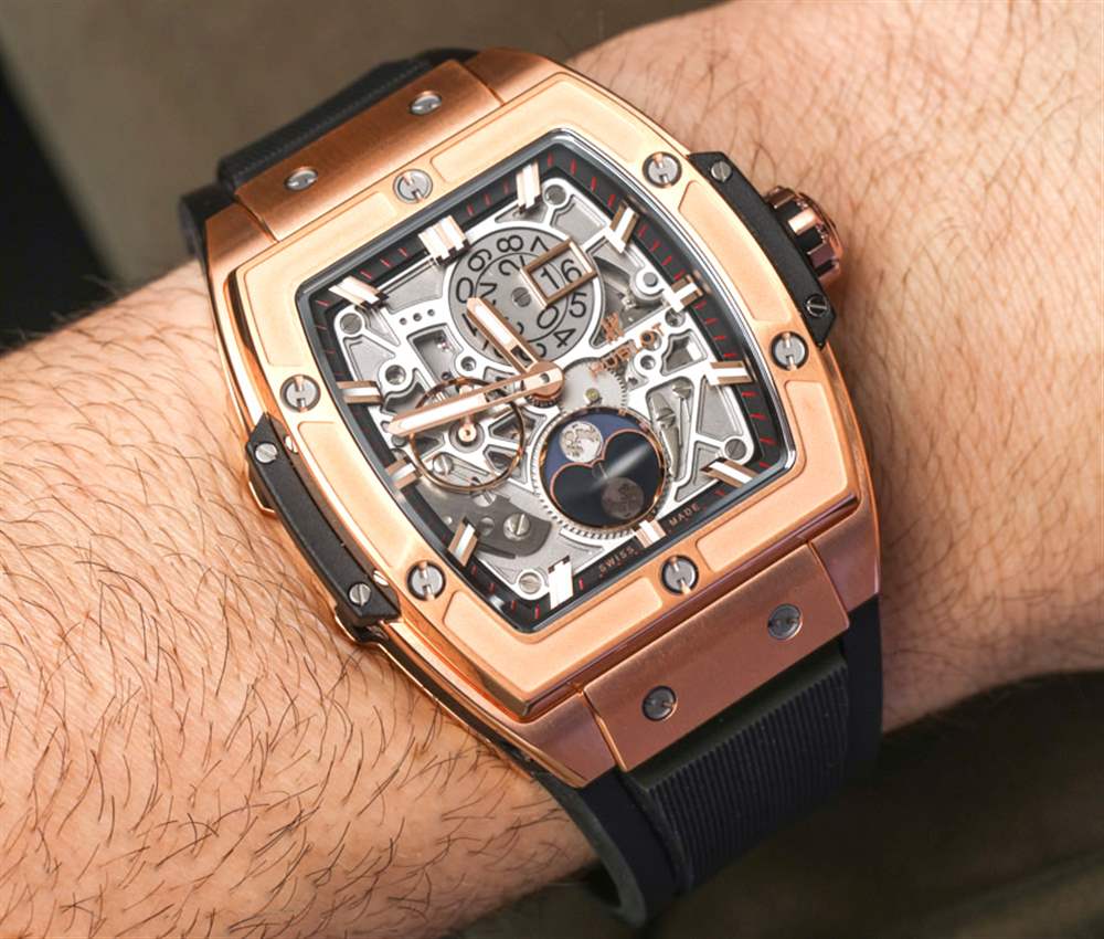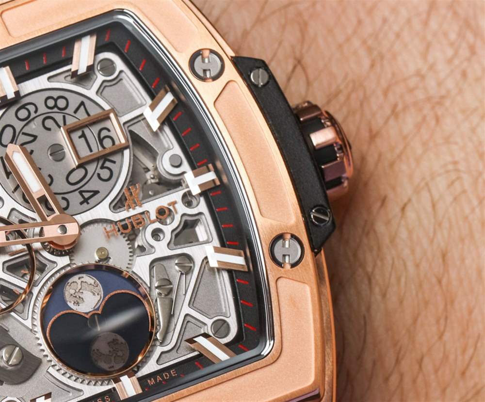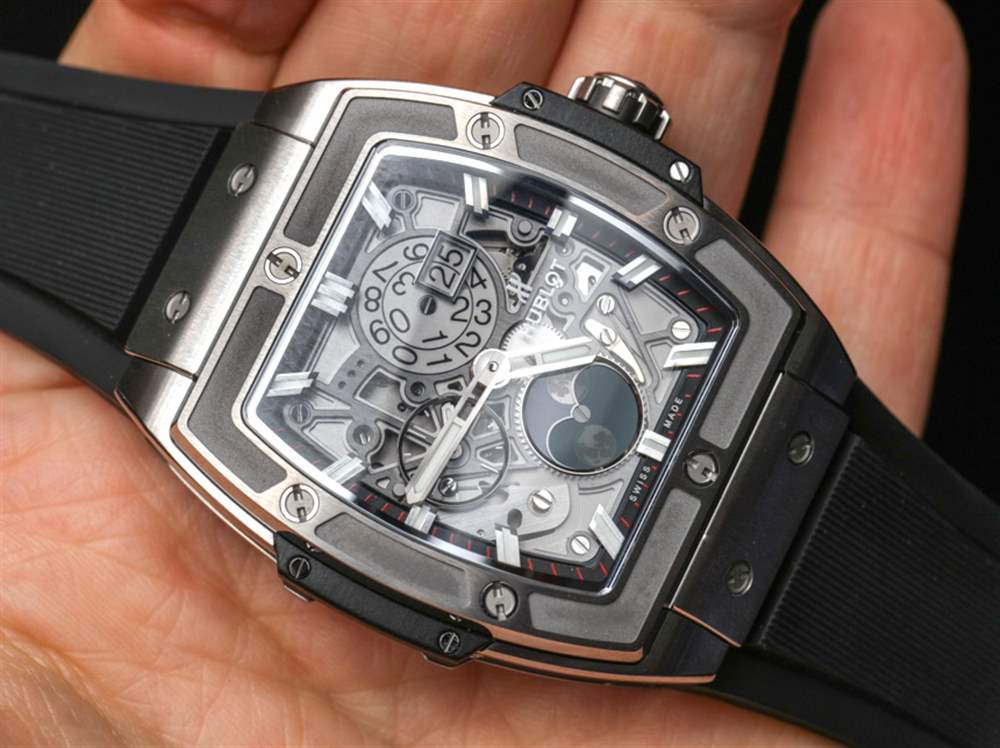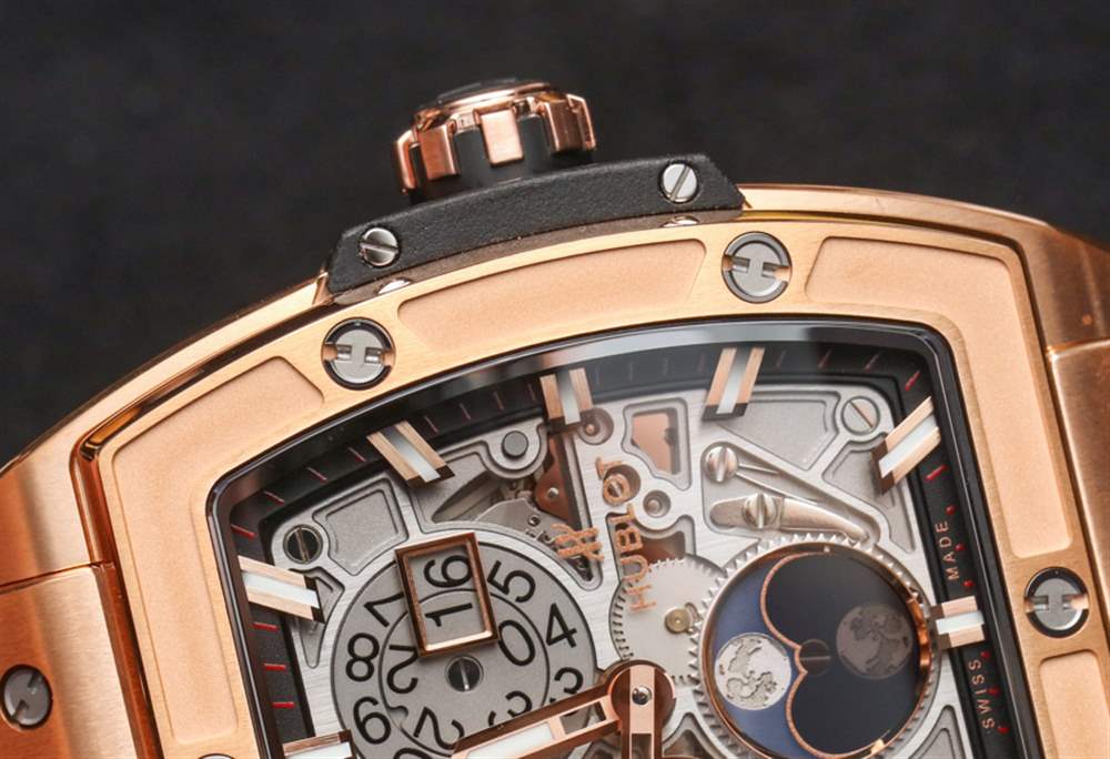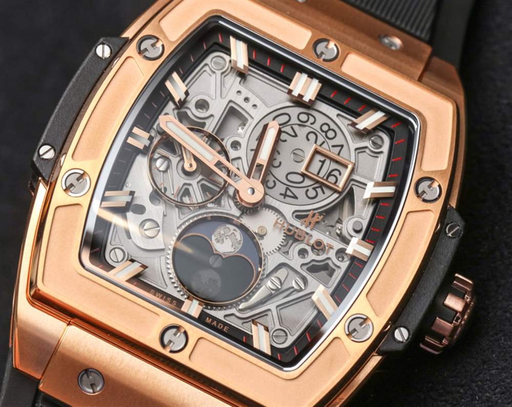最初的 Hublot Spirit Of Big Bang 采用 45 毫米寬的表殼,考慮到酒桶形表殼的長尺寸,對于大多數(shù)手腕來說都相當(dāng)大。Hublot Spirit Of Big Bang Moonphase 特別系列首次亮相更小、更耐磨的 42 毫米寬酒桶形表殼(防水深度達(dá) 100 米)。目前,這些較新的 Big Bang 精神月相腕表有兩種版本,一種為鈦金屬,另一種為 18K 王金(基本上是紅金)。