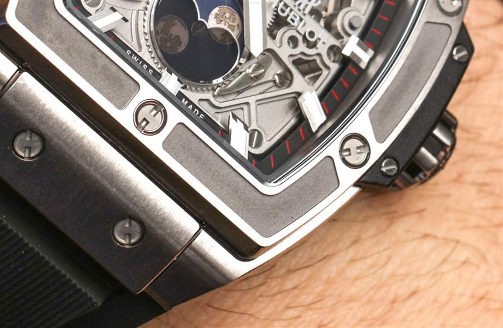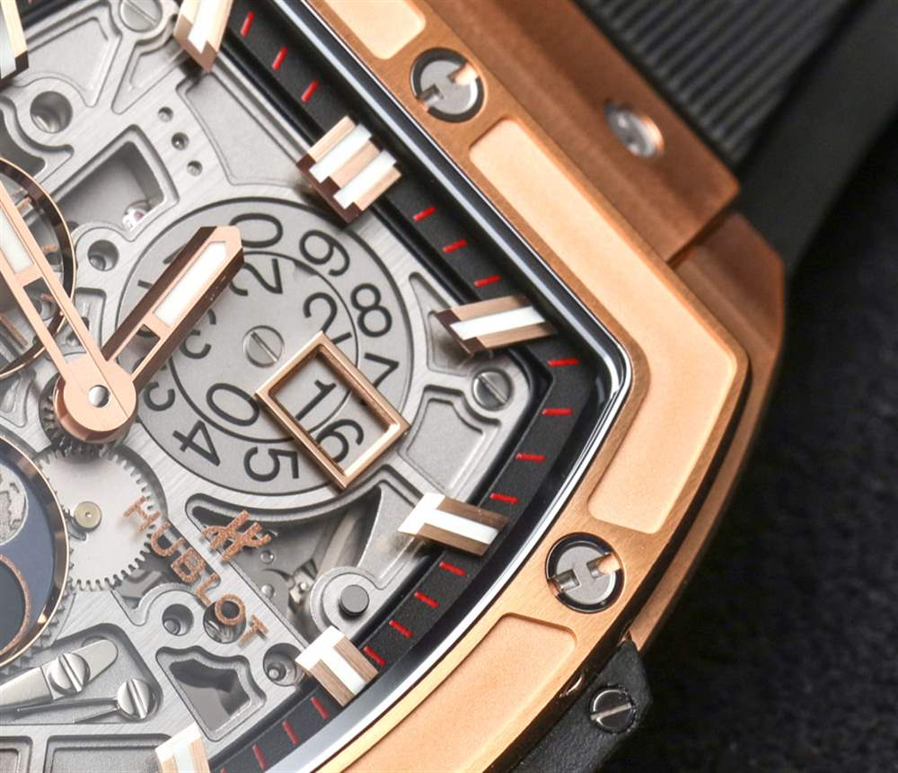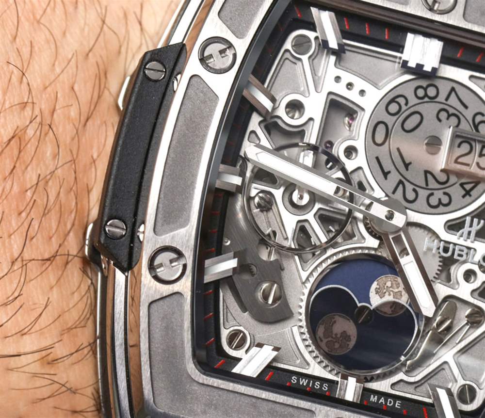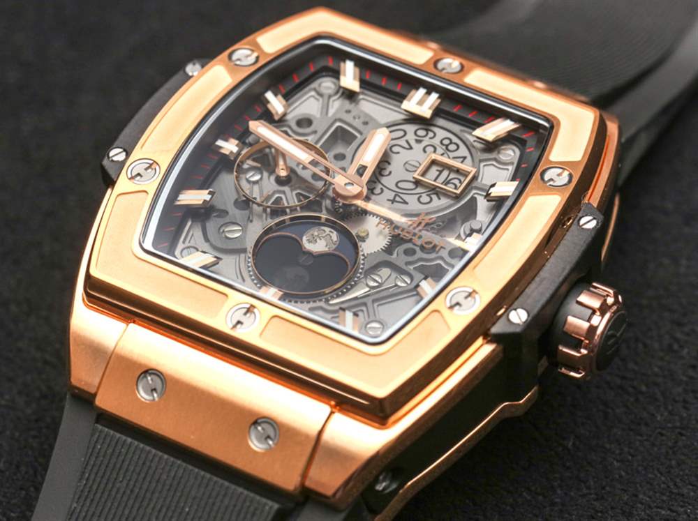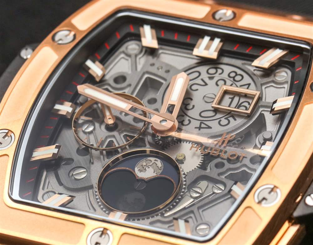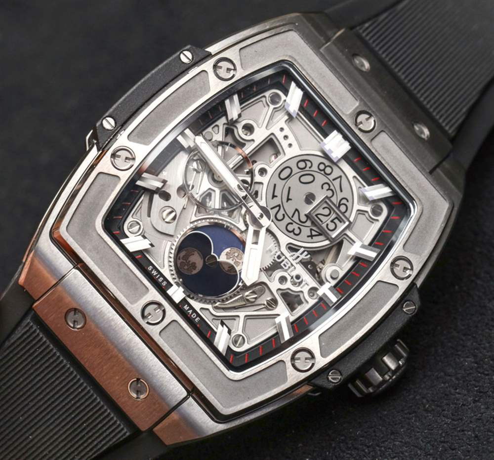 最初的 Hublot Spirit Of Big Bang 采用 45 毫米寬的表殼,考慮到酒桶形表殼的長尺寸,對于大多數(shù)手腕來說都相當(dāng)大。Hublot Spirit Of Big Bang Moonphase 特別系列首次亮相更小、更耐磨的 42 毫米寬酒桶形表殼(防水深度達(dá) 100 米)。目前,這些較新的 Big Bang 精神月相腕表有兩種版本,一種為鈦金屬,另一種為 18K 王金(基本上是紅金)。