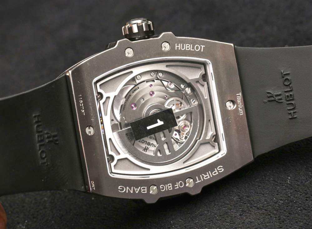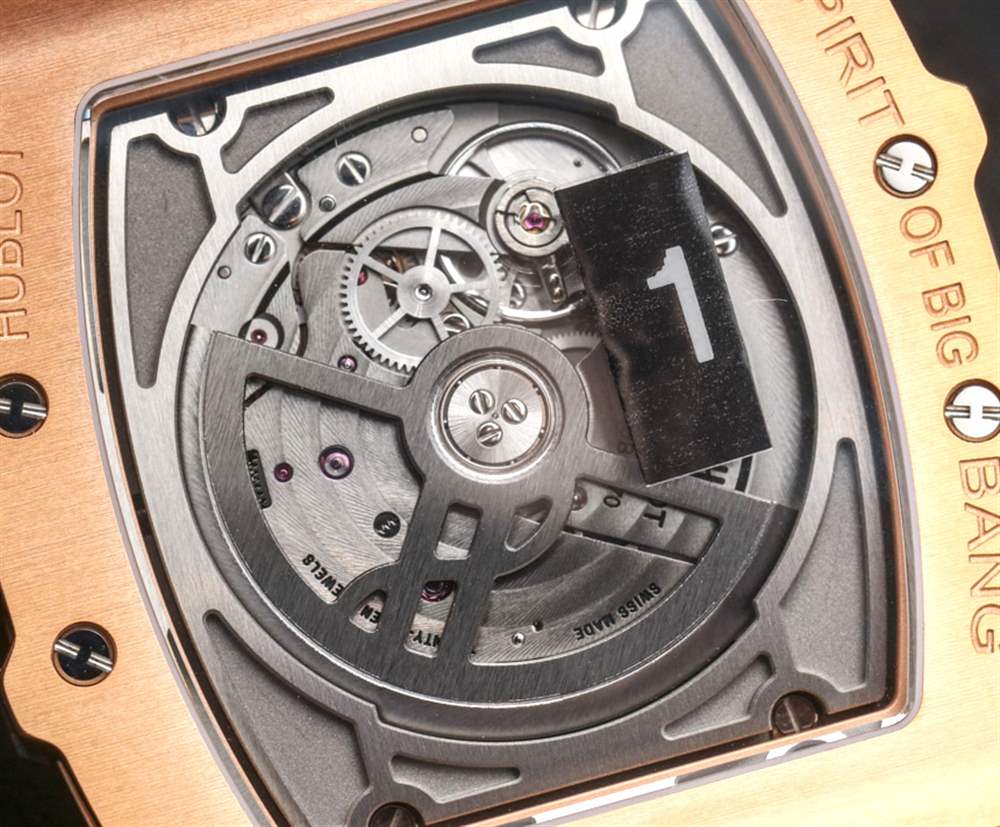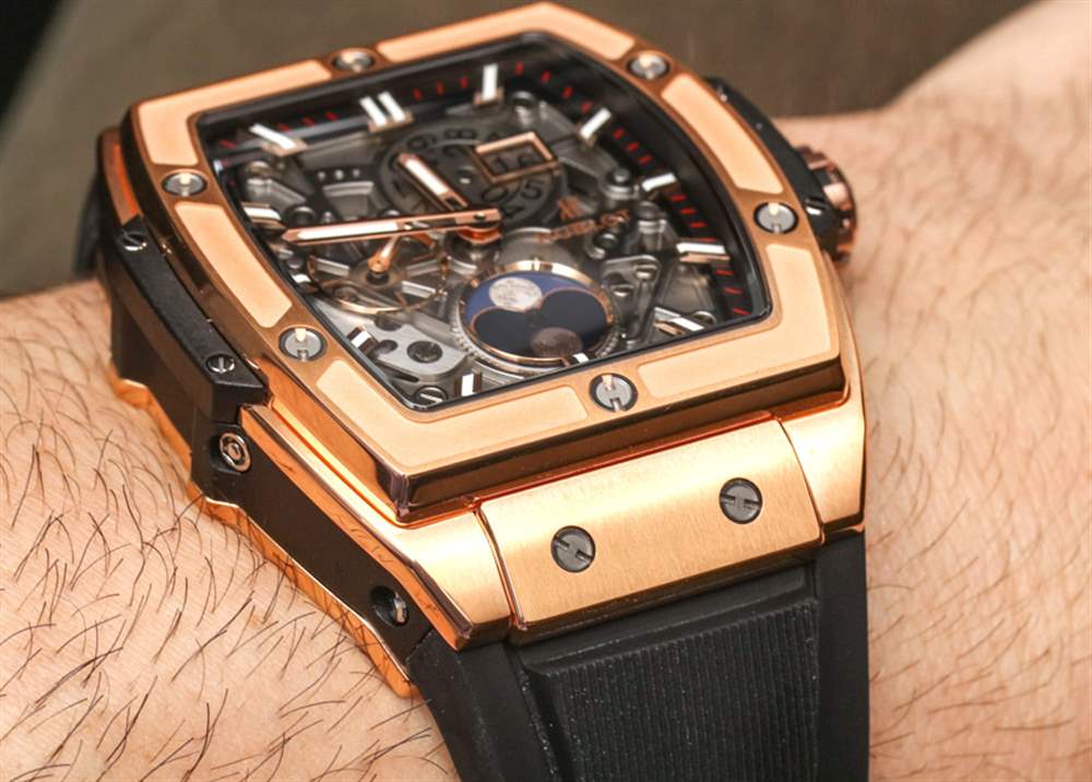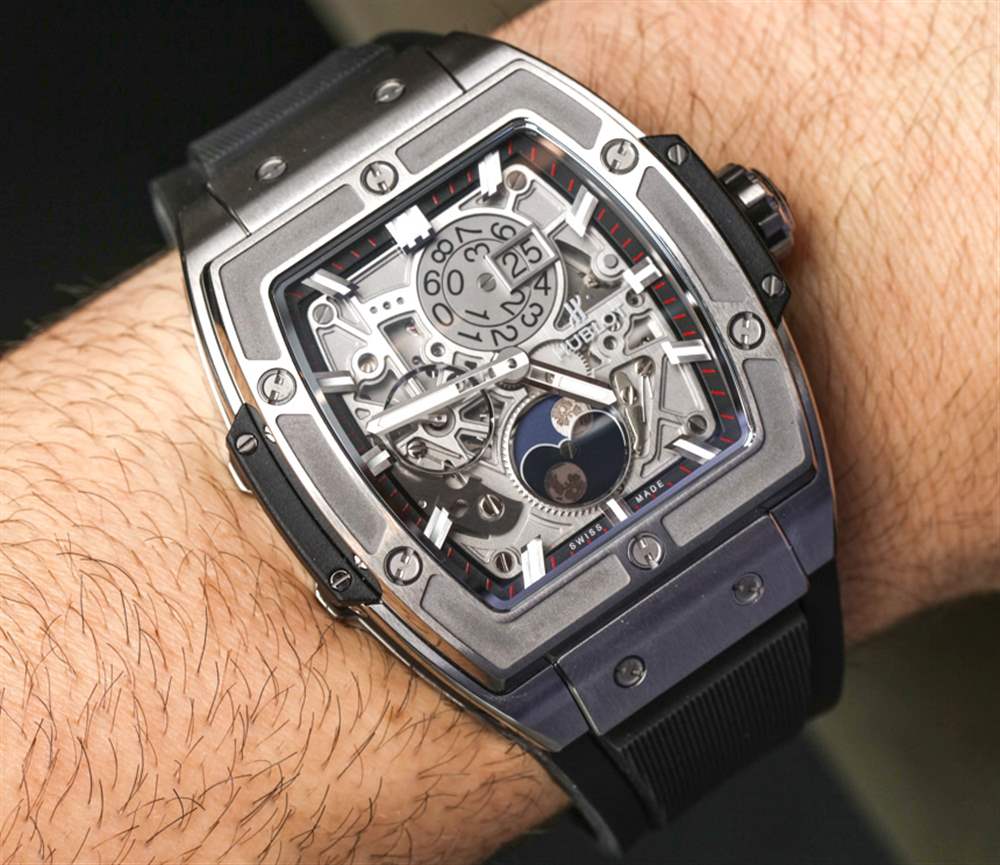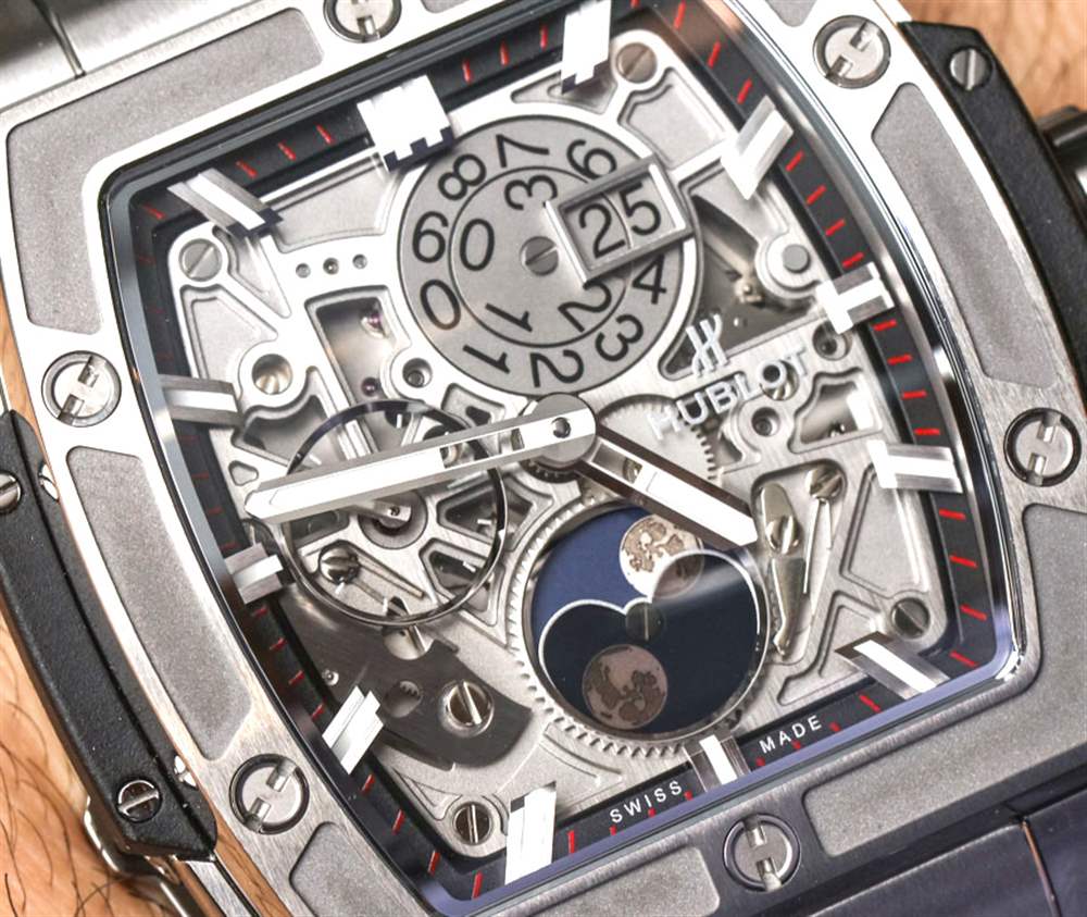 最初的 Hublot Spirit Of Big Bang 采用 45 毫米寬的表殼,考慮到酒桶形表殼的長尺寸,對于大多數(shù)手腕來說都相當(dāng)大。Hublot Spirit Of Big Bang Moonphase 特別系列首次亮相更小、更耐磨的 42 毫米寬酒桶形表殼(防水深度達(dá) 100 米)。目前,這些較新的 Big Bang 精神月相腕表有兩種版本,一種為鈦金屬,另一種為 18K 王金(基本上是紅金)。