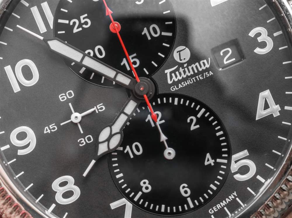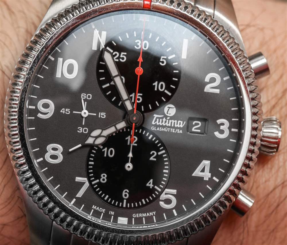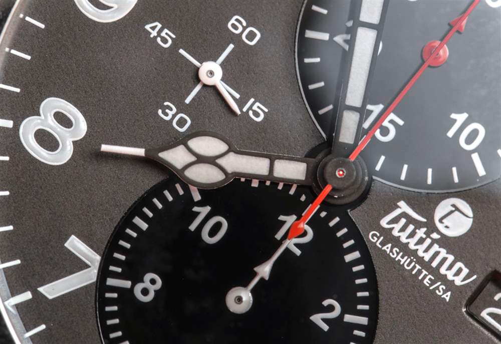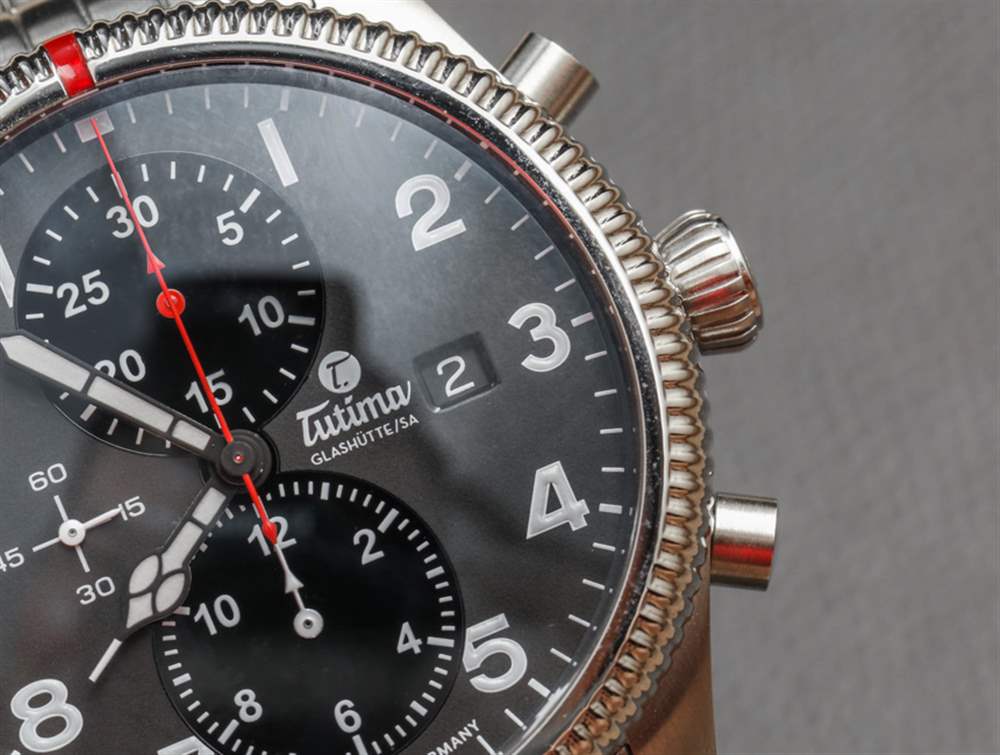 紅色的強調(diào)色也是一個重要的風格提示,謝天謝地,這種顏色的使用相當謹慎。計時碼表秒針和分針表盤使用紅色,但計時碼表時針不使用紅色。我相信這是有充分理由的,但通常在顏色編碼指針方面,時間指針是一種顏色,而計時指針是另一種顏色。因此,雖然 Tutima 渲染 Tutima Grand Flieger Classic Chronograph 表盤的方式在美學上看起來更好,但我的強迫癥告訴我計時碼表時針也應(yīng)該是紅色的。