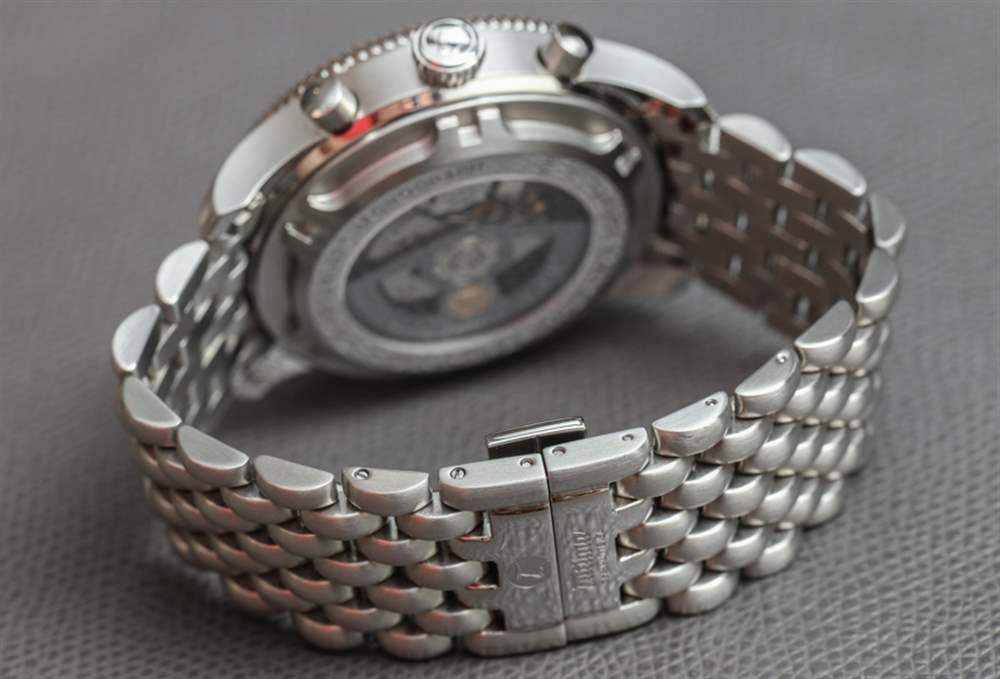 Tutima Grand Flieger Classic Chronograph 戴在手腕上非常舒適,表殼制作精良。鋼制表殼寬 43 毫米,厚 16 毫米,經(jīng)久耐用,防水深度達 200 米(表冠螺絲擰入)。表盤上方是圓頂 AR 涂層藍寶石水晶鏡面,表殼背面是展示底蓋窗口。考慮到表耳的厚度以及突出的表耳間距以容納漂亮的寬表帶或手鏈,表殼的厚度略大于 43 毫米。大部分表殼都經(jīng)過拉絲處理,表面處理非常出色,與您對這個價格的現(xiàn)代德國鋼制工具表的期望相當。