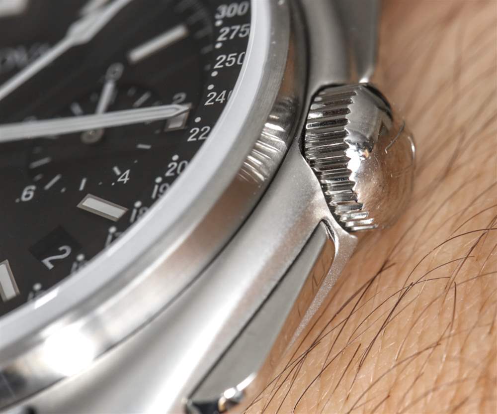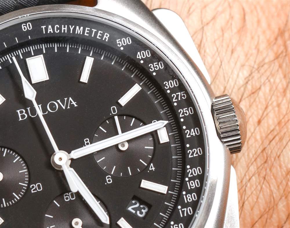 表盤周圍是一個帶有測速儀刻度的凸起 rehaut 環(huán),用于在距離參考點可見時測量速度。您很可能永遠不會使用測速儀刻度,它們作為過去的整潔痕跡繼續(xù)存在。凸起的測速刻度環(huán),以及表盤上的應(yīng)用時標和凹陷秒刻度營造出非常受歡迎的深度感。平面表盤看起來很便宜,而在寶路華特別版月球計時手表中,幸運的是這不是問題。除了令人歡迎的面部三維視圖外,指針和時標的大小也非常合適且非常相稱。在我看來,這使整體表盤設(shè)計既實用又美觀。