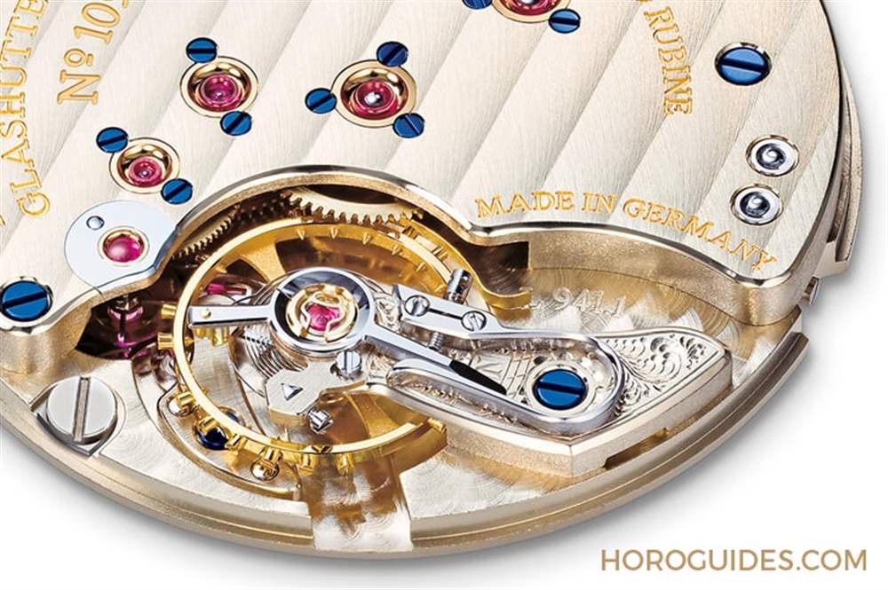 朗格的華麗向來不放在表面,而是全都放在表背了——而且是最極致的美,透過機芯的透明底蓋,可以看到德國銀夾板特殊的金屬光澤、黃金套筒和紅寶石軸承、藍鋼螺絲以及擺輪橋板上的手工雕花。