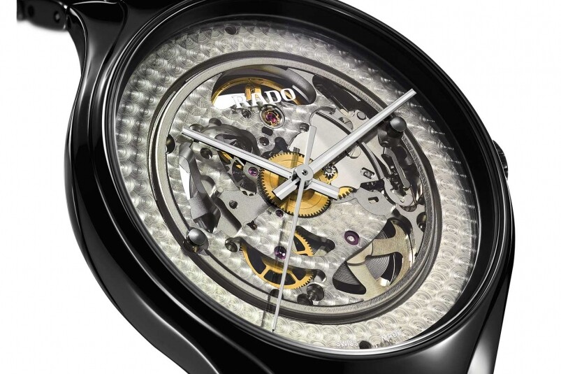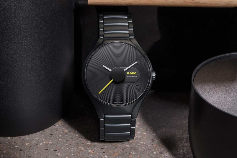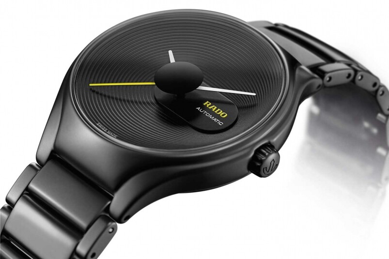 這款True真系列圓紋腕表是由Rado及Rainer Mutsch共同設計的腕表,是整個系列之中,我最想立刻擁有的腕表,全黑的簡約設計之中,帶著亮眼的黃色秒針及Rado標志,夠擔眼!但是細看一下,表盤亦非平面一片黑色,而是有著非對稱排列的下降階梯結構,帶來一種立體感,而指針的懸浮效果亦因而更加突出。而其圓紋設計,不只在表面,更一直延伸到表底,上面更有一個小型藍寶石玻璃窗口讓你可以看見機芯,帶來更多趣味。