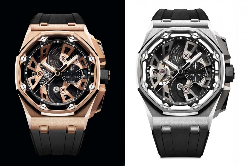 如果要形容這全新的Royal Oak Offshore Tourbillon Chronograph,我會形容為充滿未來感及建筑結(jié)構(gòu)感,看進去表盤的設(shè)計,你可以感到猶如一座未來建筑的微縮結(jié)構(gòu)似的。必須留意的是,AP經(jīng)典的八角鏍絲仍然都在,但卻放在藍寶石玻璃之下,不再只是為了固定表圈而設(shè),卻是直透機芯,將機芯部件固定,將結(jié)構(gòu)從表面一直延伸至心臟,與其他的Royal Oak Offshore大有不同!