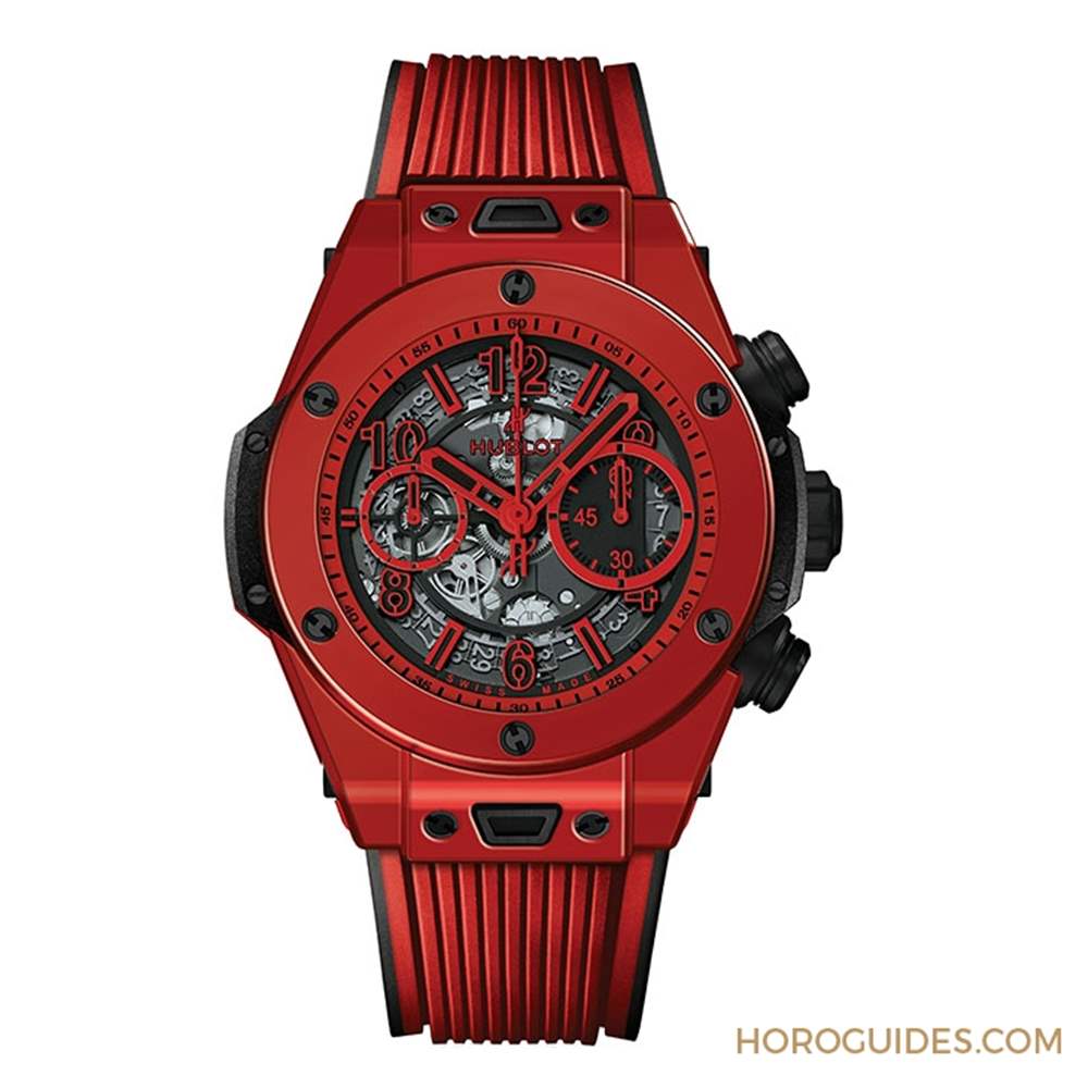 BIG BANG UNICO RED MAGIC表徑45mm,搭配自制HUB1242 UNICO自動上鏈飛返計時導柱輪機芯,表殼與表冠皆由宇舶專利魔力紅陶瓷所打造,限量500只。