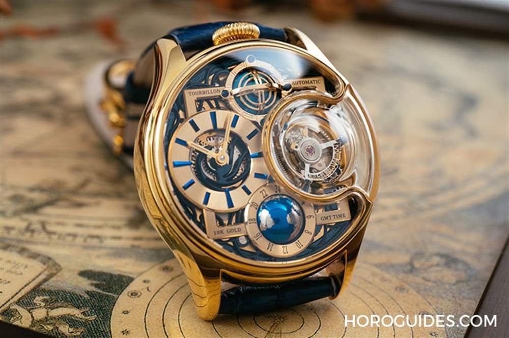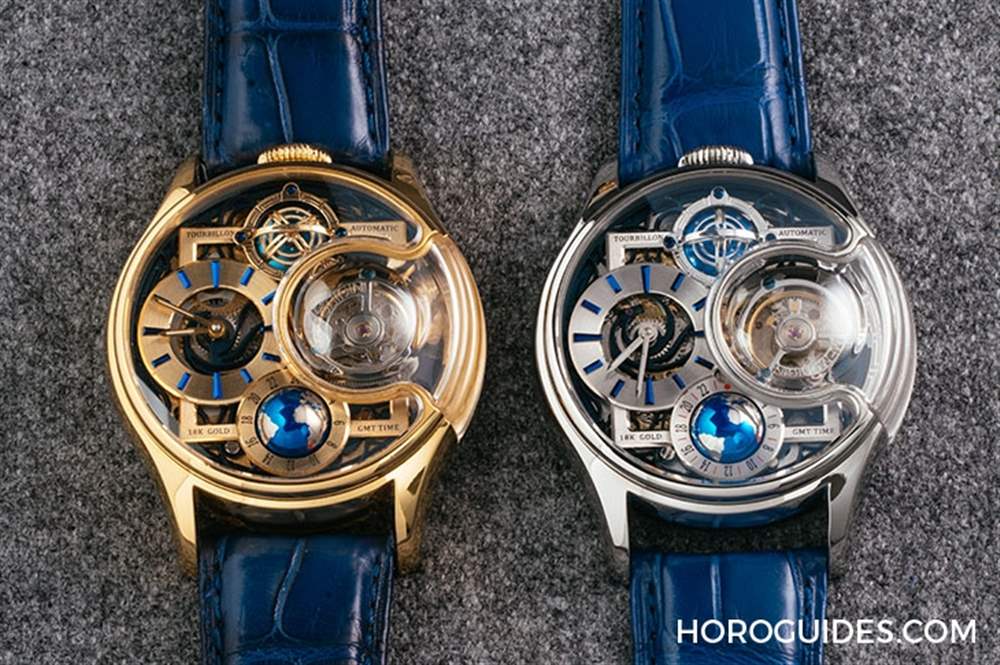 6點鐘位置的是球體GMT兩地時間顯示裝置,透過右上方的紅點指示第二地時間。