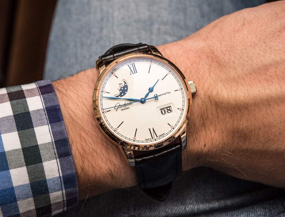 40 毫米寬的表殼尺寸也沒有變化,格拉蘇蒂原創(chuàng)參議員卓越大日歷和月相腕表在手腕上繼續(xù)看起來既帥氣又厚實(shí)。比只有時間的三手卓越參議員更厚,感覺就像一個堅(jiān)固的 40 毫米,而不是小東西。但是,我會說,如果您是那種覺得 40 毫米是大表而 42 毫米寬太大的人,我建議您確保為手表選擇較短的表帶或選擇不使用折疊展開器扣,因?yàn)樗粫裨诠饣暮谏{魚皮表帶上帶有更傳統(tǒng)的針式針扣的手表那樣舒適。