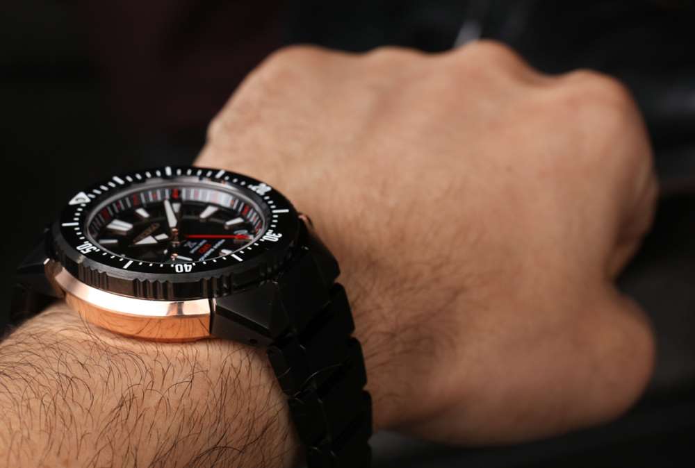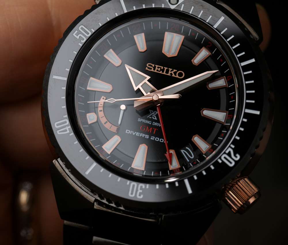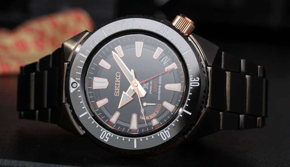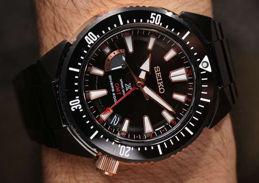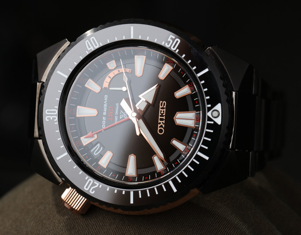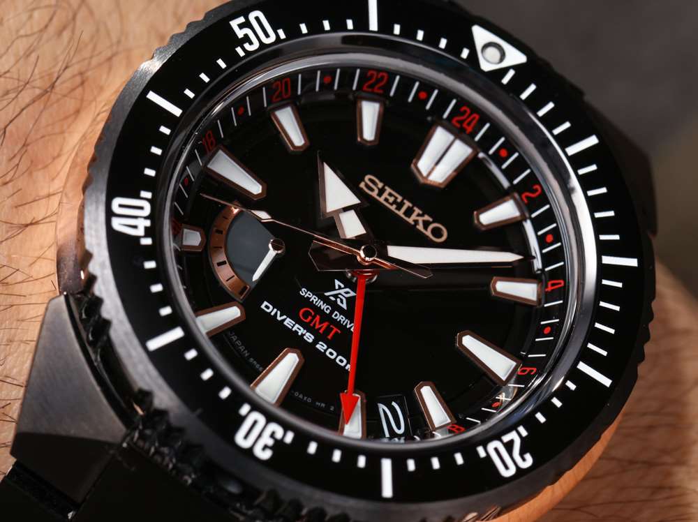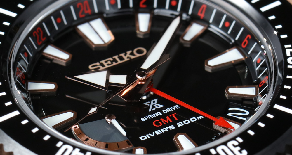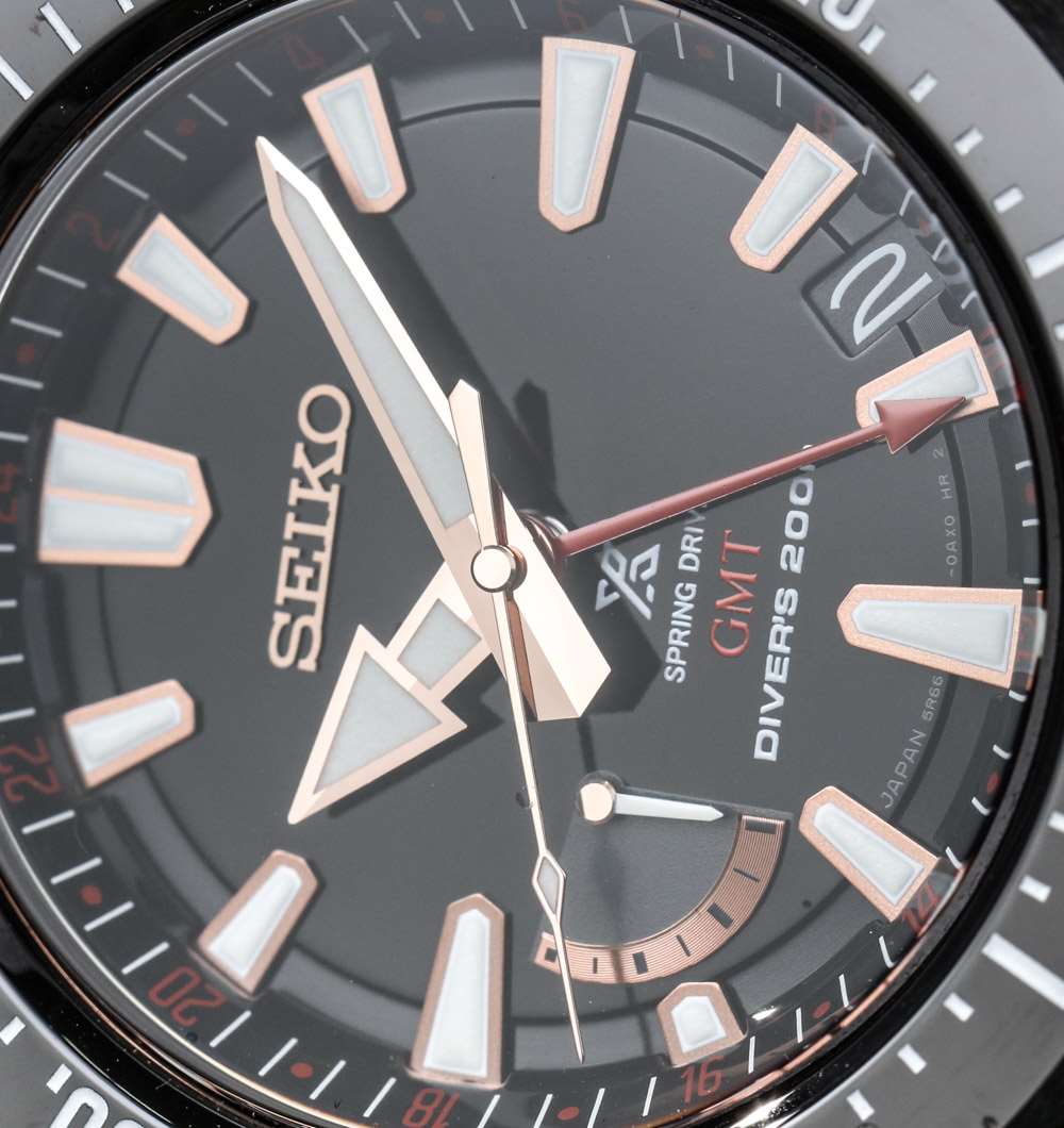 這款精工 Prospex 200M GMT 的特殊版本是參考 SBDB018,它采用略顯華麗的黑色,帶有玫瑰金色中層表殼和表盤裝飾。在平坦的 AR 涂層藍寶石水晶下,易讀性非常好。從易讀性的角度來看,紅色很有意義,但我認為這款手表看起來會更精致一點,紅色要少一點(只是個人喜好)。作為一款GMT腕表,傾斜的凸緣環上設有24小時標記,日期窗口并沒有去除任何小時標記,形成立體對稱。精工在黑色表盤上很好地使用了黑色日期盤……表盤上使用了精工專有的 Lumibrite lume(可能產生積極的發光效果)。