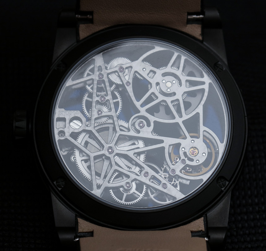 在為手表手動上弦時,您可以看到動力從無鑰匙上弦系統傳輸到齒輪,其中包括來自自動上弦系統的可拆卸變速器。然后,這些齒輪將動力傳輸至直接為主發條上弦的齒輪。然后您可以看到來自彈簧的動力如何釋放到調節系統,然后調節系統將小而一致的動力分配給移動指針的大火車。在鏤空機芯的兩側,透過藍寶石水晶玻璃,一切都非常簡單,但非常清晰可見。