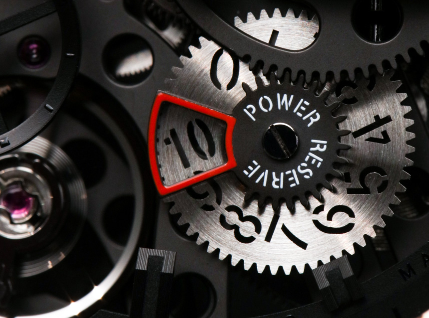 在我看來,完全開放的表盤和鏤空的 HUB1201 機芯是這款時計的魅力所在。功能重點是10天動力儲存。分為兩個主發條盒,“大約 10 天”的動力儲存由兩個動力儲存指示器指示。一種是一種數字動力儲備指示器,通過帶有模版切割數字的圓盤顯示。我相信這是一個跳躍指標,數字每天都在倒計時。第二個動力儲存指示器是齒條式系統的一部分,位于主發條盒上方,有兩個齒形部分。
