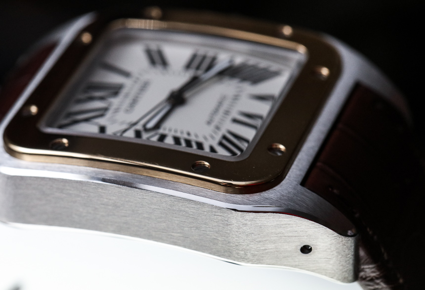 卡地亞桑托斯 100 型號 W20073X8 的基礎(chǔ)型號采用全鋼黑色表帶,而型號 W20072X7 則配備棕色鱷魚皮表帶和 18k 黃金表圈。它也恰好是我最喜歡的。表圈無疑是 Santos 100 系列中最獨特的元素,而且是您在 Santos-Dumont 上看不到的元素。卡地亞過去當(dāng)然也生產(chǎn)過其他帶有“旋入式”方形表圈的小型 Santos 型號——這種外觀已經(jīng)延續(xù)到該品牌的許多珠寶系列中,例如非常流行的 LOVE 手鐲式手鐲,它似乎有用螺絲擰緊它……實際上是用螺絲固定在手腕上的。