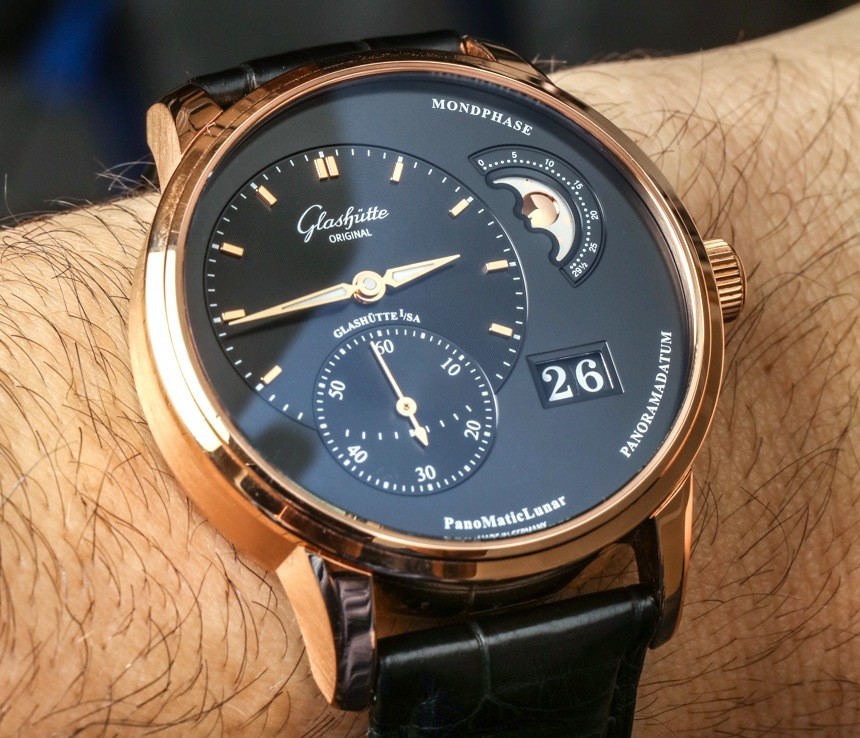 在手腕上,Glashütte Original PanoMaticLunar 的尺寸更為傳統,寬度為 40 毫米——此處采用 18k 紅金打造,看起來十分光滑。就像我說的,這款手表也有鋼制的。Glashütte Original PanoMaticLunar 的厚度為 12.7 毫米,考慮到機芯的尺寸,這是可以理解的,但它比正裝表更厚。話雖如此,對于那些覺得 40 毫米寬的尺寸不夠大的人來說,近 13 毫米的厚度確實有助于讓手表感覺更大。我也很欣賞,雖然它不是運動手表,但 50 米的防水性能優于您在許多其他類似手表中看到的 30 米防水性能。