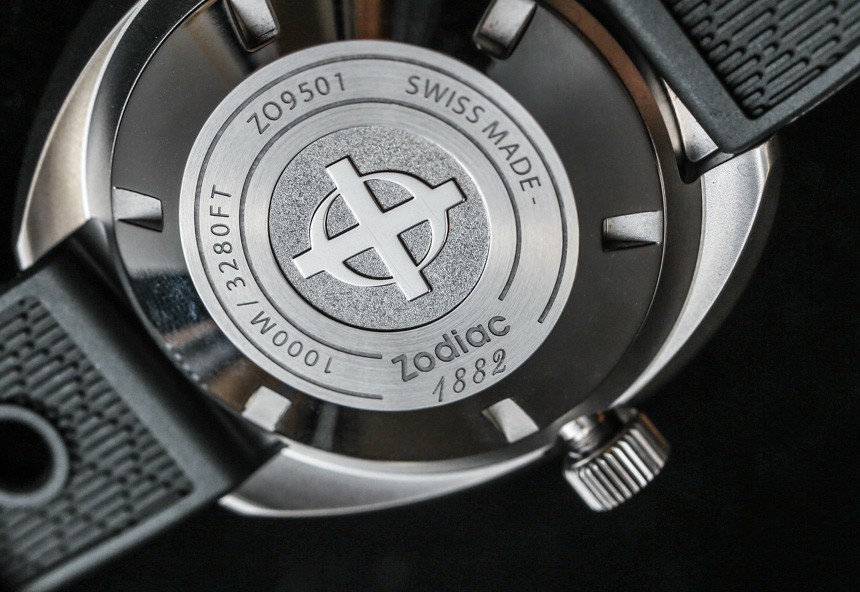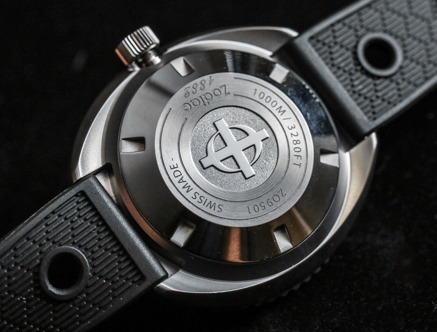 Zodiac 設計了旋轉表圈,在印刷的黑色背景上覆蓋了礦物水晶。擋板看起來不錯,還有一個“安全”系統,可以防止它意外轉動。要轉動單向擋板,您需要按下它,然后轉動它,感受 60 次穩固的咔噠聲。