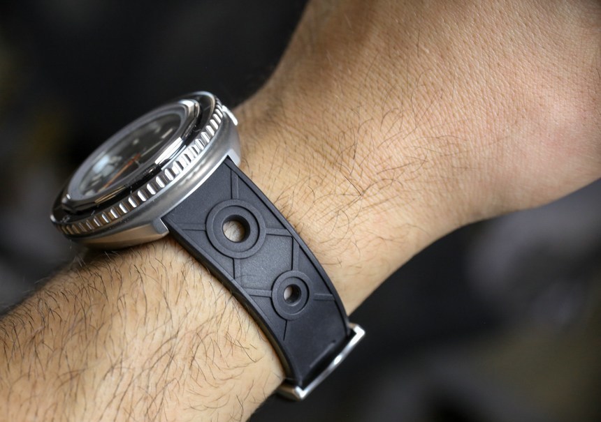 44 毫米寬的酒桶形表殼是 1970 年代許多其他運動手表的常見款式,今天又出現在許多現代潛水表中。這是一個非常實用和獨特的外觀,對我來說,比具有更傳統的帶表耳的圓形表殼的潛水表更能說明“潛水”。表殼的薄型外觀部分來自于表殼后部逐漸變細并帶有氣泡式后蓋的事實。這意味著雖然您在手腕上感覺不到它,但底蓋至少向表耳延伸了幾毫米。
