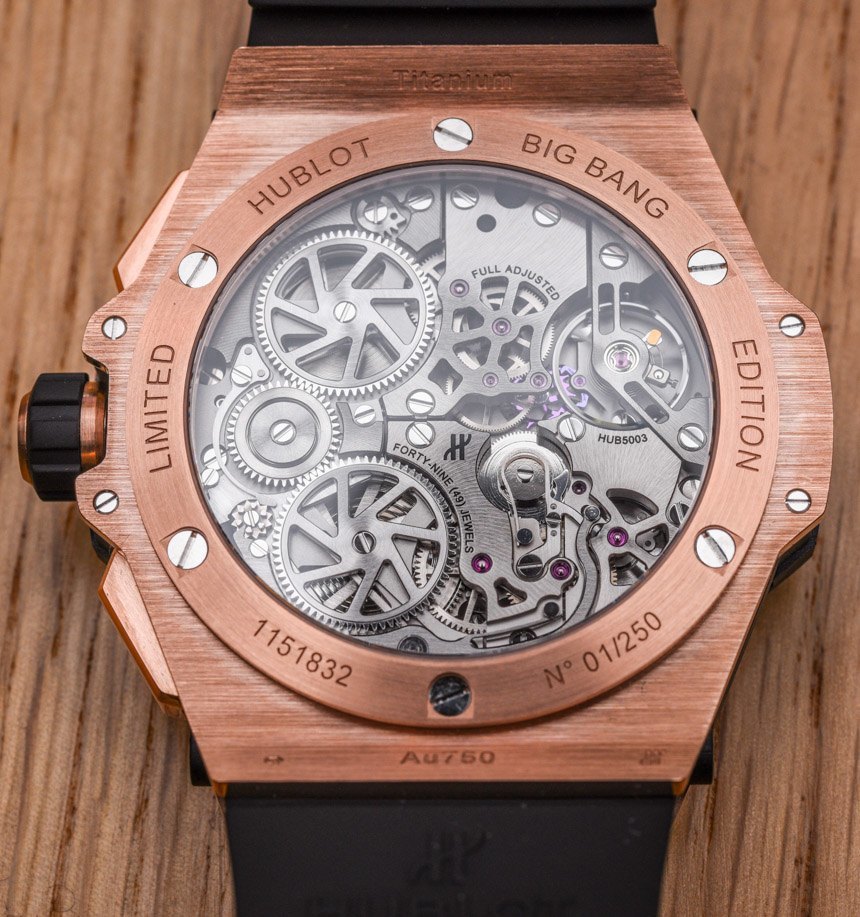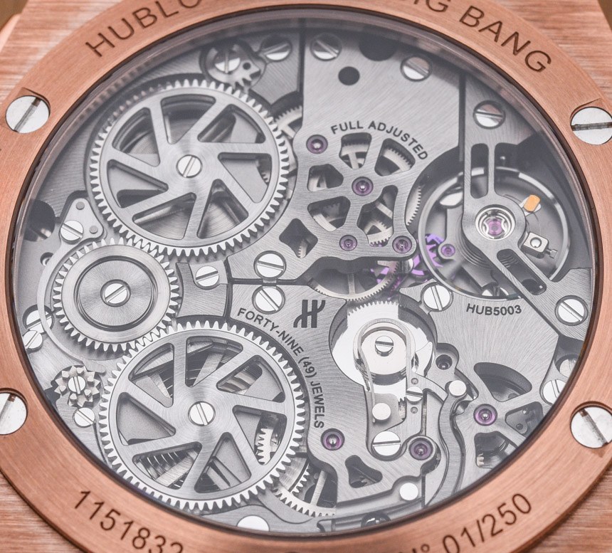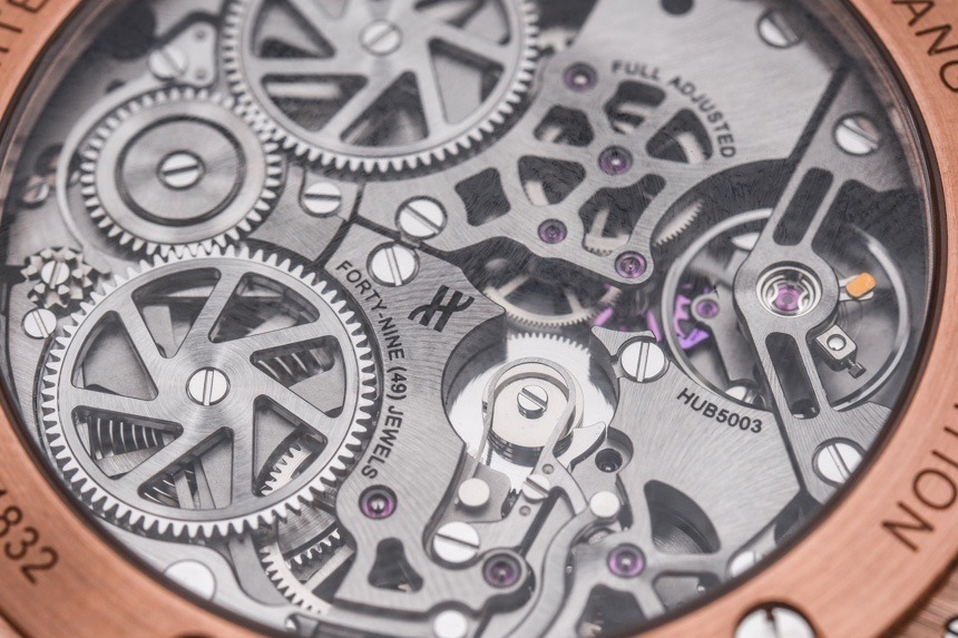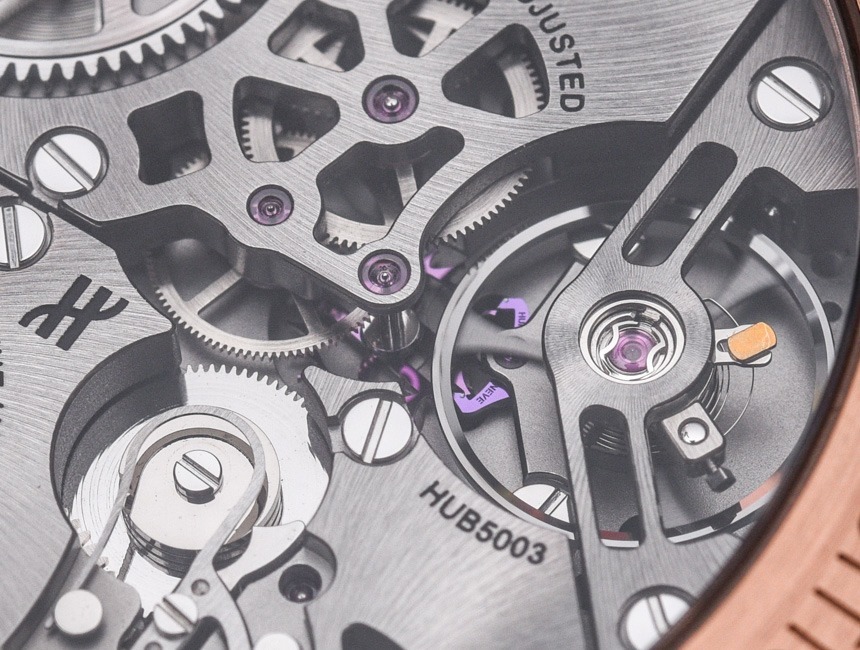 HUB5003機(jī)芯采用硅質(zhì)擒縱系統(tǒng),動(dòng)力儲(chǔ)存72小時(shí),包括帶24小時(shí)指示的時(shí)間、用于設(shè)置未來24小時(shí)鬧鐘時(shí)間的24小時(shí)表盤,以及一個(gè)警報(bào)并發(fā)癥的開/關(guān)開關(guān)。此外,表盤由半透明材料(幾層彩色藍(lán)寶石水晶)制成,即使 Hublot Big Bang Alarm Repeater 沒有所謂的鏤空表盤,也可以瞥見下面的機(jī)芯。