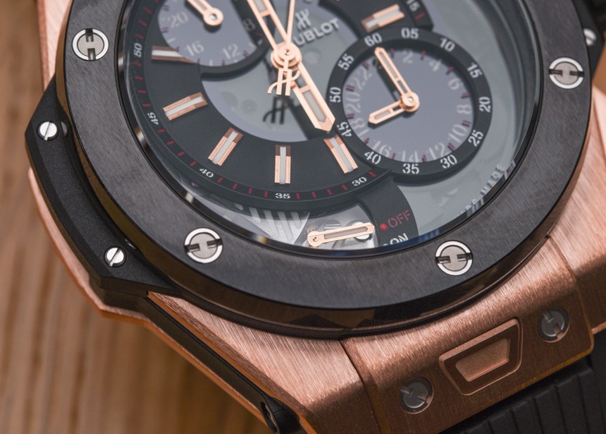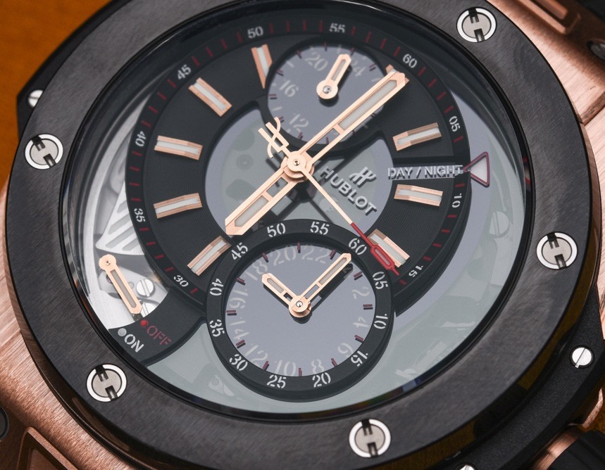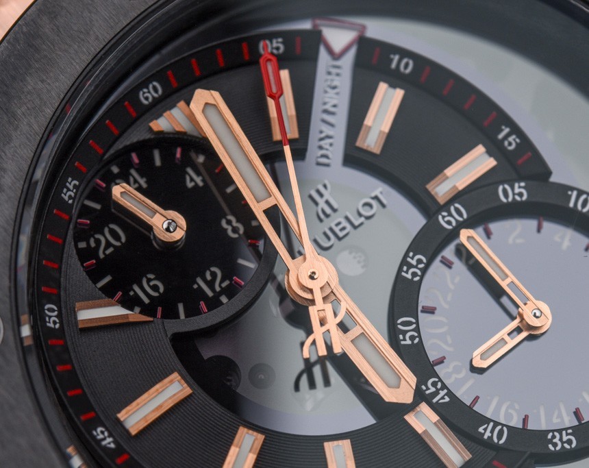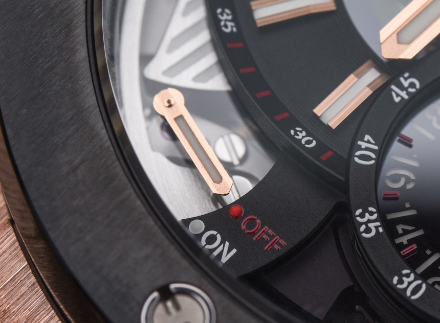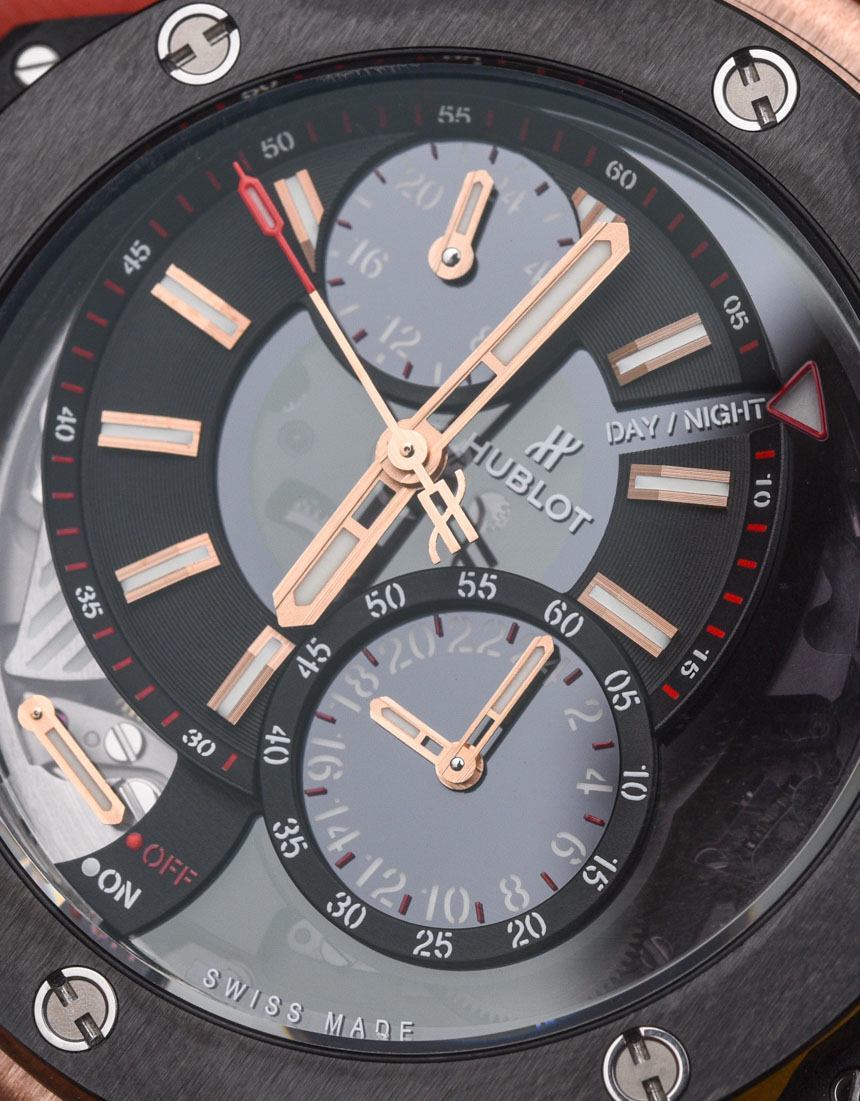 關(guān)于 Hublot Big Bang Alarm Repeater 表盤,您首先會(huì)注意到的一件事是主表盤有點(diǎn)偏離中心。這可能是我所知道的唯一一款像這樣的 Hublot Big Bang 手表——而且它可能是唯一一款。這可能看起來是一件小事,但它賦予了這款手表在品牌中完全獨(dú)特的個(gè)性,盡管表殼顯然是現(xiàn)代的 Big Bang。
