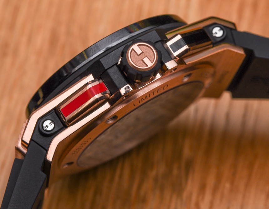 在45mm寬處,可以清楚地看到這是宇舶表在2013年推出的新款Big Bang 45表殼。然而,Hublot 為這種情況使用了獨(dú)特的推動(dòng)器設(shè)計(jì)。推動(dòng)器更加微妙,與表殼齊平,這很有趣。Hublot Big Bang Alarm Repeater 提供兩個(gè)版本——每個(gè)版本都有黑色陶瓷表圈。型號(hào) 403.NM.0123.RX 配備鈦金屬表殼,而型號(hào) 403.OM.0123.RX 配備 18k 王金(紅金)表殼。