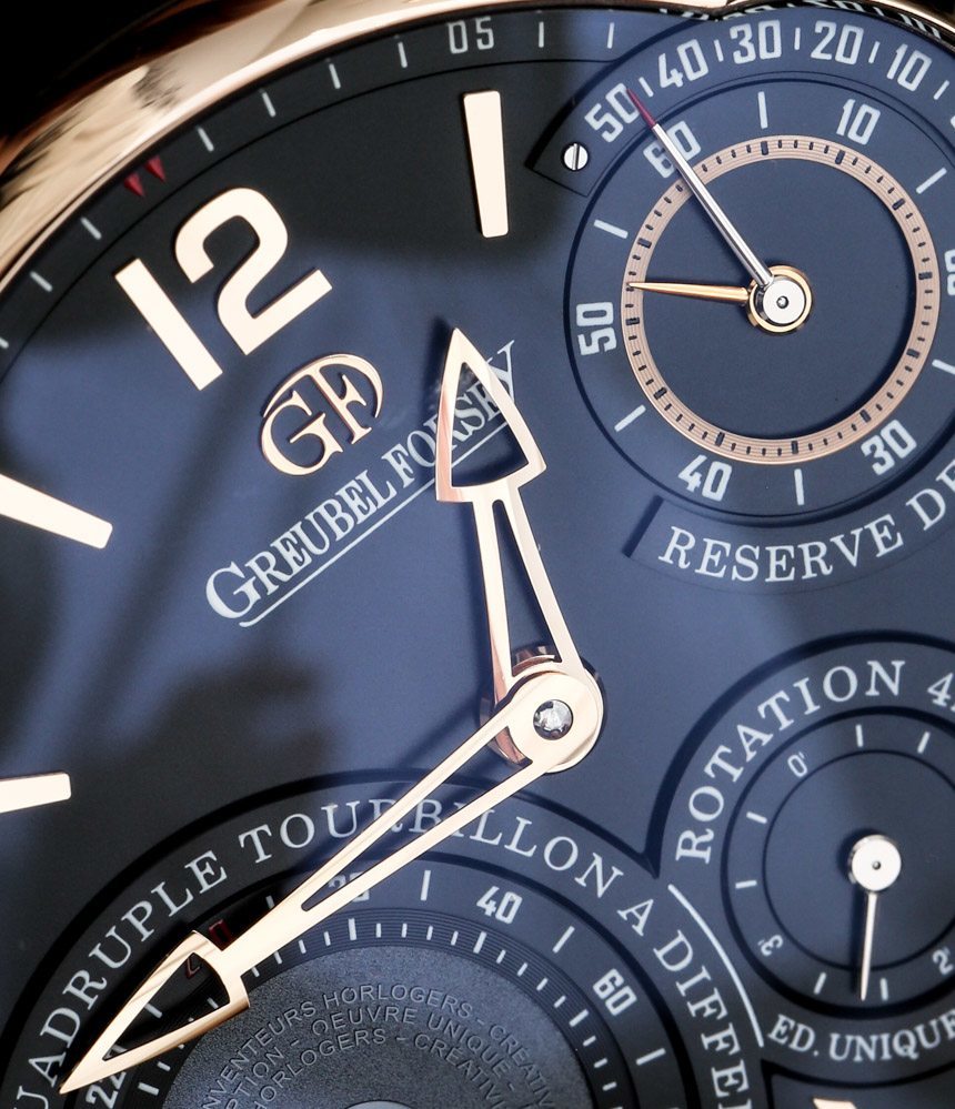 Greubel Forsey Quadruple Tourbillon Secret 寬 43.5 毫米,厚 16.11 毫米,雖然不是一款小巧的手表,但它非常耐磨——老實說,就像大多數高珀富斯時計一樣。作為黑色和金色的粉絲,我非常喜歡搭配 18k 紅金表殼和應用表盤元素的黑色表盤。適當的整理還可以確保一切都很好且清晰易讀。