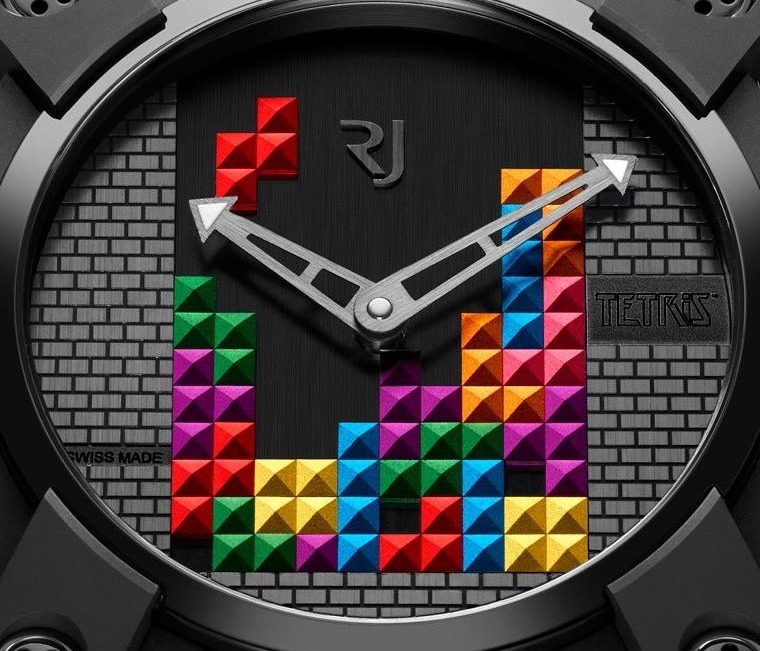 Romain Jerome Tetris-DNA 手表將采用 46 毫米寬的 PVD ??涂層黑色鈦金屬表殼,并配有特殊表盤,包括手工設置的“俄羅斯方塊表盤”。每個“Tetrimino”塊均由彩色陽極氧化鋁制成,并由手工鑲嵌。因此,Tetriminos 是三維的,并與實際積木的標志性游戲屏幕框架相對應。