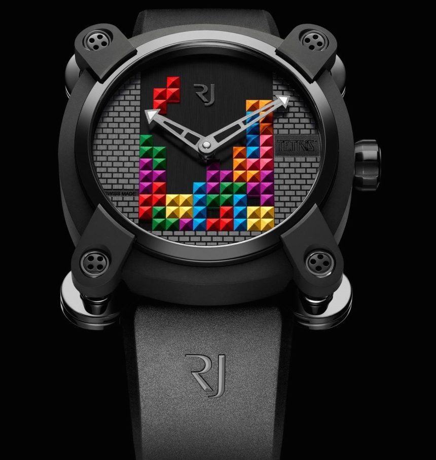 具有諷刺意味的是,盡管 Romain Jerome Tetris-DNA 手表所用的顏色很吸引人,但如果這真的是某人的俄羅斯方塊游戲屏幕,那他們將是一個糟糕的玩家!手表內部是瑞士自動機械機芯,僅顯示帶有小時和分鐘的時間。附在表殼上的是一條黑色橡膠表帶。
