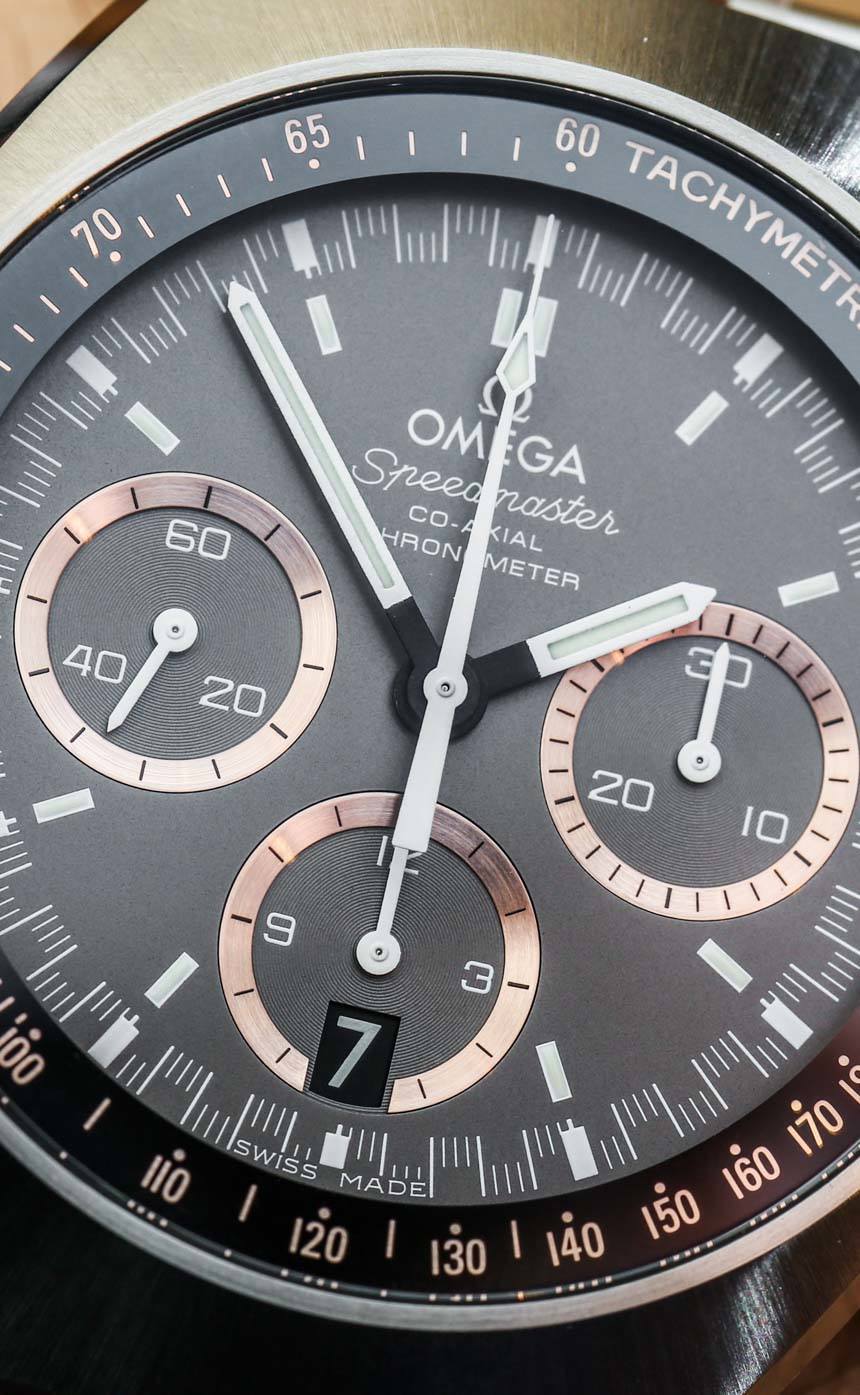 歐米茄超霸 Mark II Sedna 的灰色表盤與灰色和橙色款相似,但沒有橙色,輔助表盤周圍有金色圓環(huán)。還要注意速度計(jì)刻度上的文字使用了一些金色。別忘了,刻度位于表盤上方一點(diǎn),藍(lán)寶石水晶下方,背面涂有發(fā)光體。這也許是有史以來亮度最好的測速計(jì)刻度。