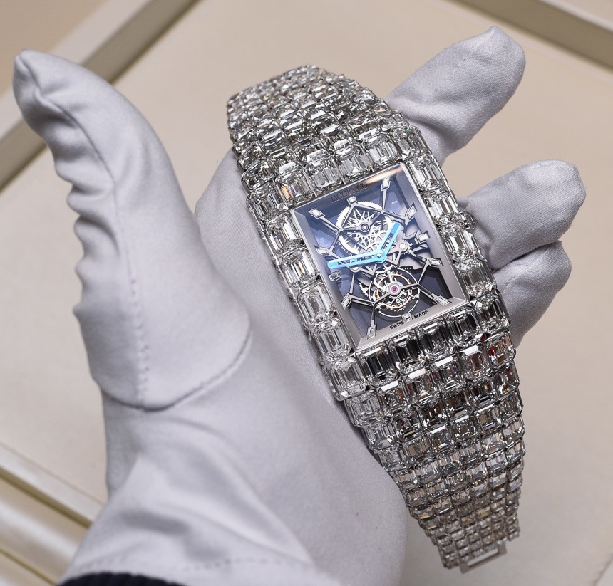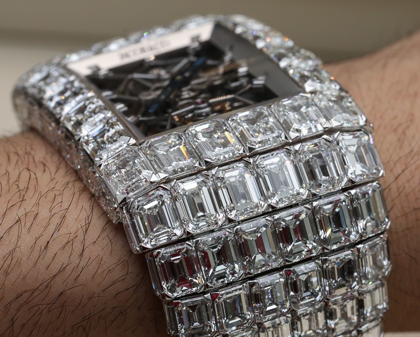 如果你相當(dāng)保守地投資 18,000,000 瑞士法郎,并且每年只賺……比如說 7%,那就是每年 1,260,000 瑞士法郎。按當(dāng)前匯率計(jì)算,這大約是 130 萬美元。這意味著,如果您每年花費(fèi)所有利息收入,那么 Jacob & Co. Billionaire 手表的價(jià)格將使您在余生中每年以 130 萬美元(給予或索取)為生。當(dāng)然,這涉及稅收,但對(duì)于這個(gè)星球上的大多數(shù)人來說,這是一種非常好的生活方式。為生活而鑲嵌……或者這組 260 克拉的長(zhǎng)方形切割大鉆石鑲嵌在我的手腕上,顯然我的手腕太小,無法佩戴和欣賞;這最終提醒您,您可以在不考慮太多的情況下買賣人。如果您沒有注意的話,這就是 Jacob & Co. 的品牌。