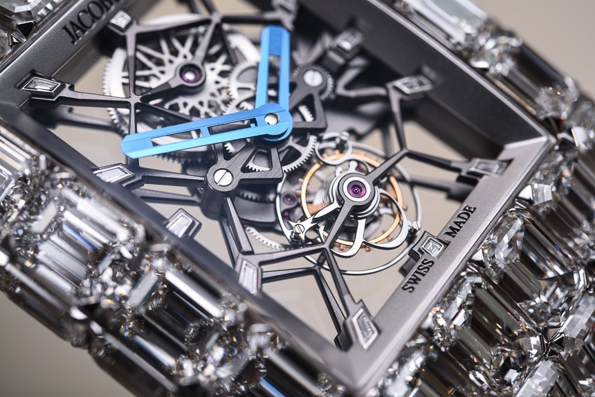 歸根結(jié)底,Jacob & Co. Billionaire 手表仍然是一款奢華時(shí)計(jì),Jacob & Co. 并沒有忘記這一點(diǎn)。Jacob & Co. Billionaire 內(nèi)部的機(jī)芯是 Jacob & Co. 的獨(dú)家機(jī)芯 JCAM09 手動(dòng)上鏈陀飛輪鏤空機(jī)械機(jī)芯。機(jī)芯以 3Hz 頻率運(yùn)行,動(dòng)力儲(chǔ)存為 72 小時(shí)。表盤實(shí)際上有小時(shí)刻度(可能是整個(gè)手表上最小的鉆石)和非常容易看到的藍(lán)鋼指針。機(jī)芯的結(jié)構(gòu)非常吸引人,非常適合 Jacob & Co. Billionaire 的整個(gè)構(gòu)圖。