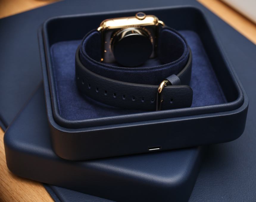 Apple Watch Edition 還配備了一個特殊的盒子,可以兼作充電站。盒子有兩種顏色,藍色和柔和的淺灰色。這些盒子旨在用作在充電時或旅行時保護 Apple Watch Edition 的一種方式。盒子背面有一個Lightning線接口。Apple 還為 Apple Watch Edition 配備了標準的磁性充電底座和電纜——因此它基本上配備了兩種充電選項,而其他 Apple Watch 型號僅配備了一個充電器。