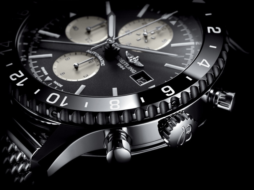 我認(rèn)為這是百年靈第一次(或者說是罕見的情況)在百年靈 Chronoliner 的表圈上使用黑色陶瓷。我很確定有一些黑色外殼的 Breitling 型號(hào),但我不記得有任何一款將鋼制外殼與黑色陶瓷混合在一起。這遵循了許多其他品牌提出的趨勢(shì)。在這種情況下,它很有意義,因?yàn)檫@種鋼制表殼組合上的黑色表圈是從百年靈的歷史中借來的。雖然在過去,黑色表圈只是涂漆金屬并且容易磨損。黑色陶瓷不會(huì)磨損,因此只要表圈沒有物理損壞,顏色和光澤就會(huì)永遠(yuǎn)存在。