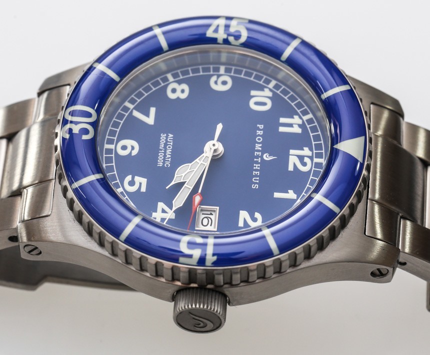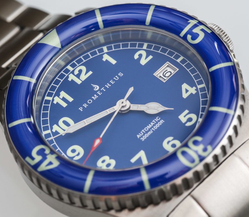 圓形藍寶石水晶表圈鑲嵌物比您有時看到的扁平鑲嵌物貴得多。分鐘刻度進一步涂上夜光漆,單向移動相當平穩穩妥。雖然,有時看著表圈和表盤的簡單、強烈的外觀,我想知道為什么普羅米修斯使用復古風格的指針。我認為 Sailfish 的整個個性會因指針似乎更適合該作品的整體潛水表主題而有所不同。