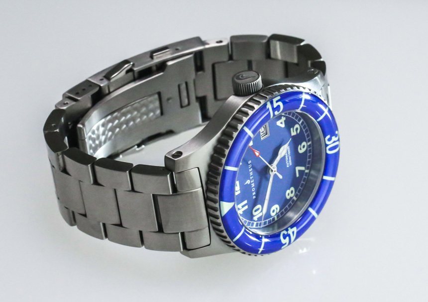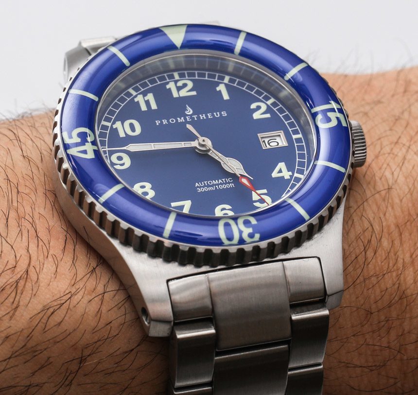 Prometheus Sailfish 寬 42 毫米,并不是一款超大手表,但由于其沉重的表殼和寬大的鋼表鏈,它確實非常耐磨。Prometheus Sailfish 表殼的主要問題是凸耳伸出的程度(表殼長 52 毫米)。它們不僅間距很大,而且沒有像應有的那樣向下彎曲。這在視覺上造成了手表的一些奇怪比例,并且從佩戴的角度來看,表殼對于小手腕和大多數中等尺寸的手腕來說會伸出太遠。話雖如此,我會說手腕較大的人會覺得 Sailfish 佩戴舒適,但手腕較小的人在購買前一定要試戴一下。