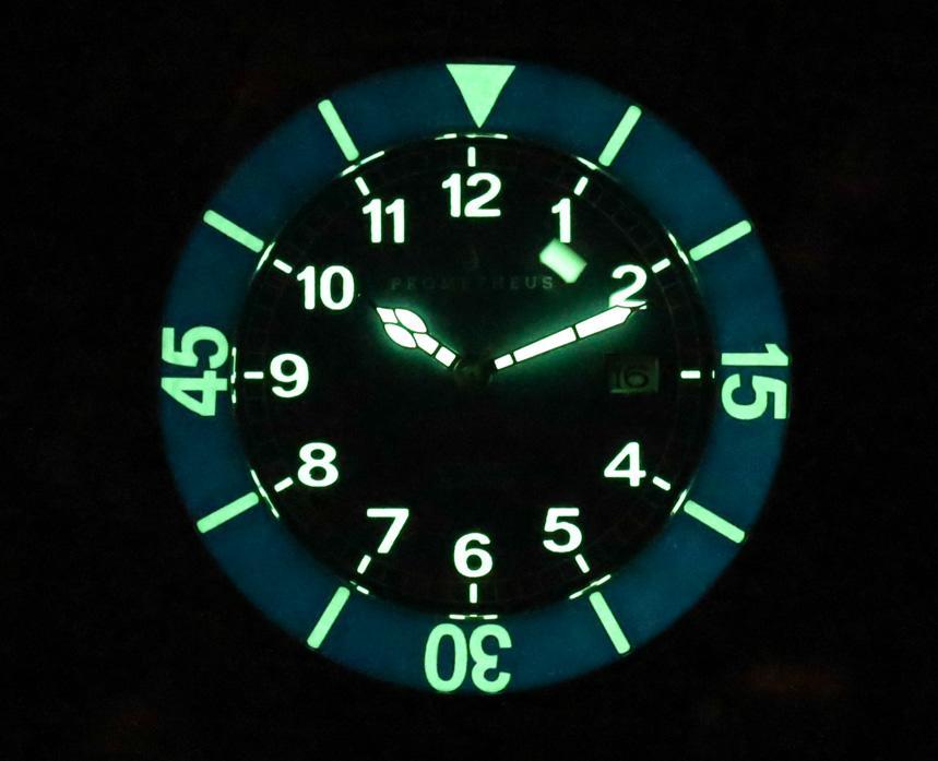 從設計的角度來看,Sailfish 的表盤是一種介于船上甲板時鐘和潛水表之間的混合物。這種組合很有趣,而且易讀性很強,但它缺少了有時從工具表中獲得的性感。話雖如此,表盤并沒有真正打破規則,因為它的指針大小合適,發光量也很大。正如您在上面的發光照片中看到的那樣,Prometheus Sailfish 表盤令人印象深刻。廣告留言廣告信息結束