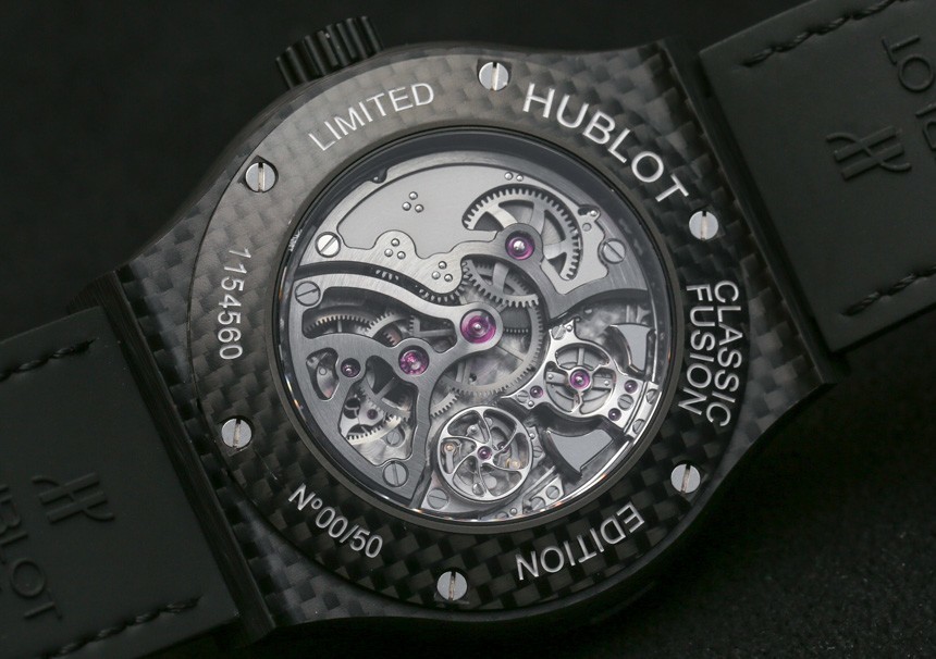 在過去的幾年里,我們看到了很多針對聲音問題的獨特解決方案,而 non 無疑是“最好的”。一些手表的音簧直接連接到藍寶石水晶上,而另一些則有特殊的共鳴室。對于 Hublot Classic Fusion Tourbillon Cathedral Minute Repeater Carbon,您有一個相對直接的解決方案,那就是使用碳纖維作為表殼材料。這實際上并不是 Hublot 第一次將三問報時器與碳纖維表殼搭配使用,但我相信之前的型號配備了 King Power 表殼和包含計時碼表的機芯。Classic Fusion 外殼在這里看起來更加優雅。