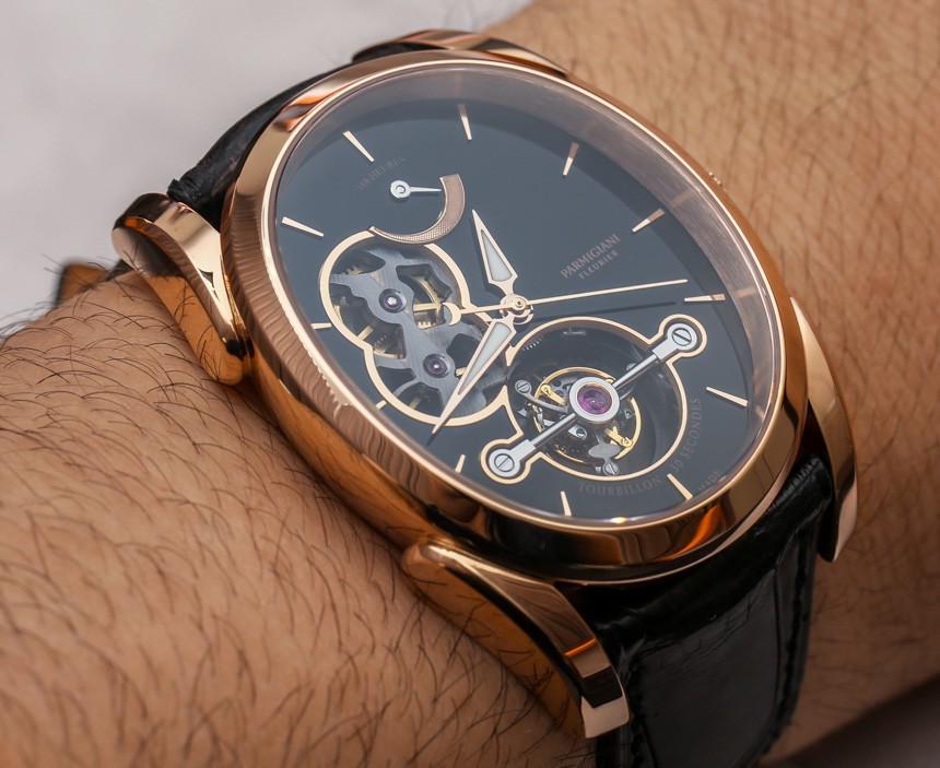 Parmigiani Ovale Tourbillon 表殼寬 37.60 毫米,高 45 毫米。表殼厚度約為 12 毫米。如果這些數(shù)字難以翻譯,只需看看手表在我手腕上的佩戴方式即可。彎曲的表耳防止手表看起來像伸出手腕較小的邊緣,設(shè)計的彎曲特性使其佩戴起來相當(dāng)討人喜歡。當(dāng)然,外觀非常標(biāo)新立異,但花這種錢的時候,大多數(shù)人并不想融入其中。至少 Parmigiani Ovale 表殼的設(shè)計“與眾不同”。